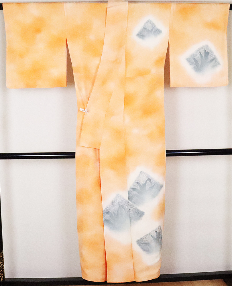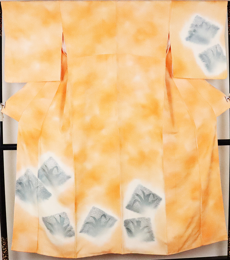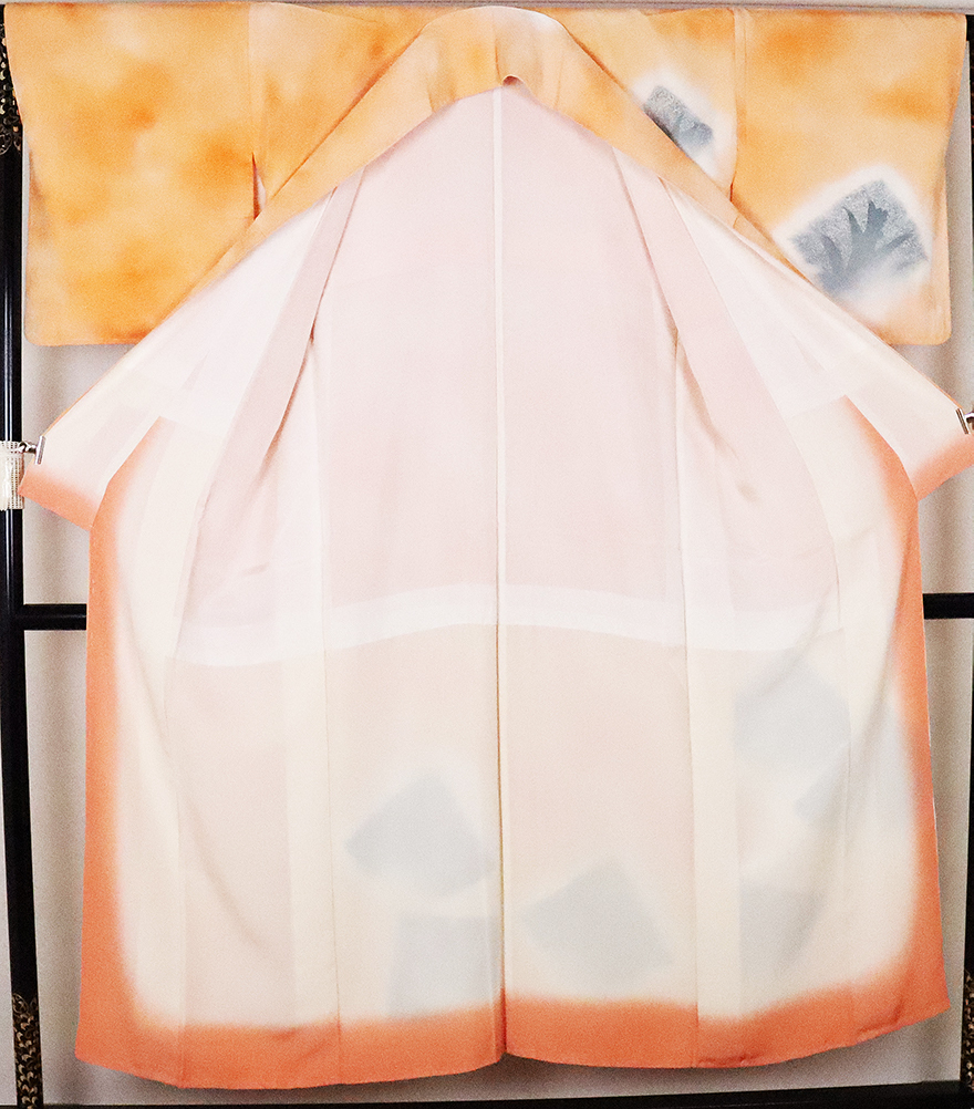 | 友禅訪問着 袷 丹後縮緬地 オレンジぼかし地草柄 158 広襟 仕付けつき | |
