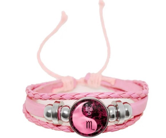 【さそり座、ピンク】12 星座ブレスレット陰陽星座ガラスカボションピンクレザーブレスレット女性女の子誕生日ギフト