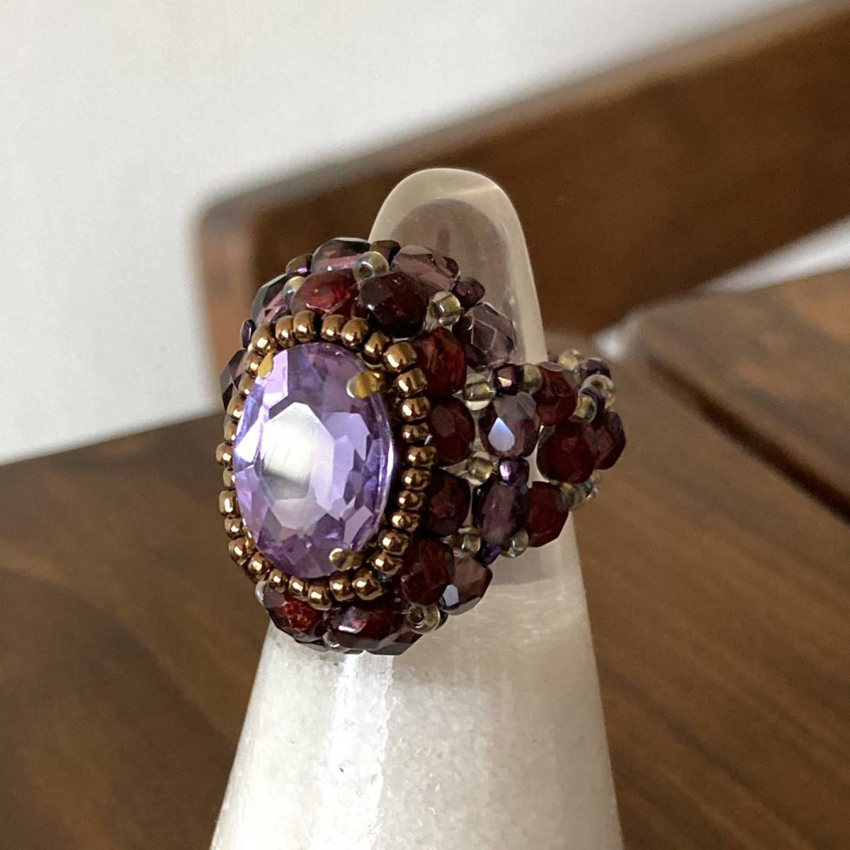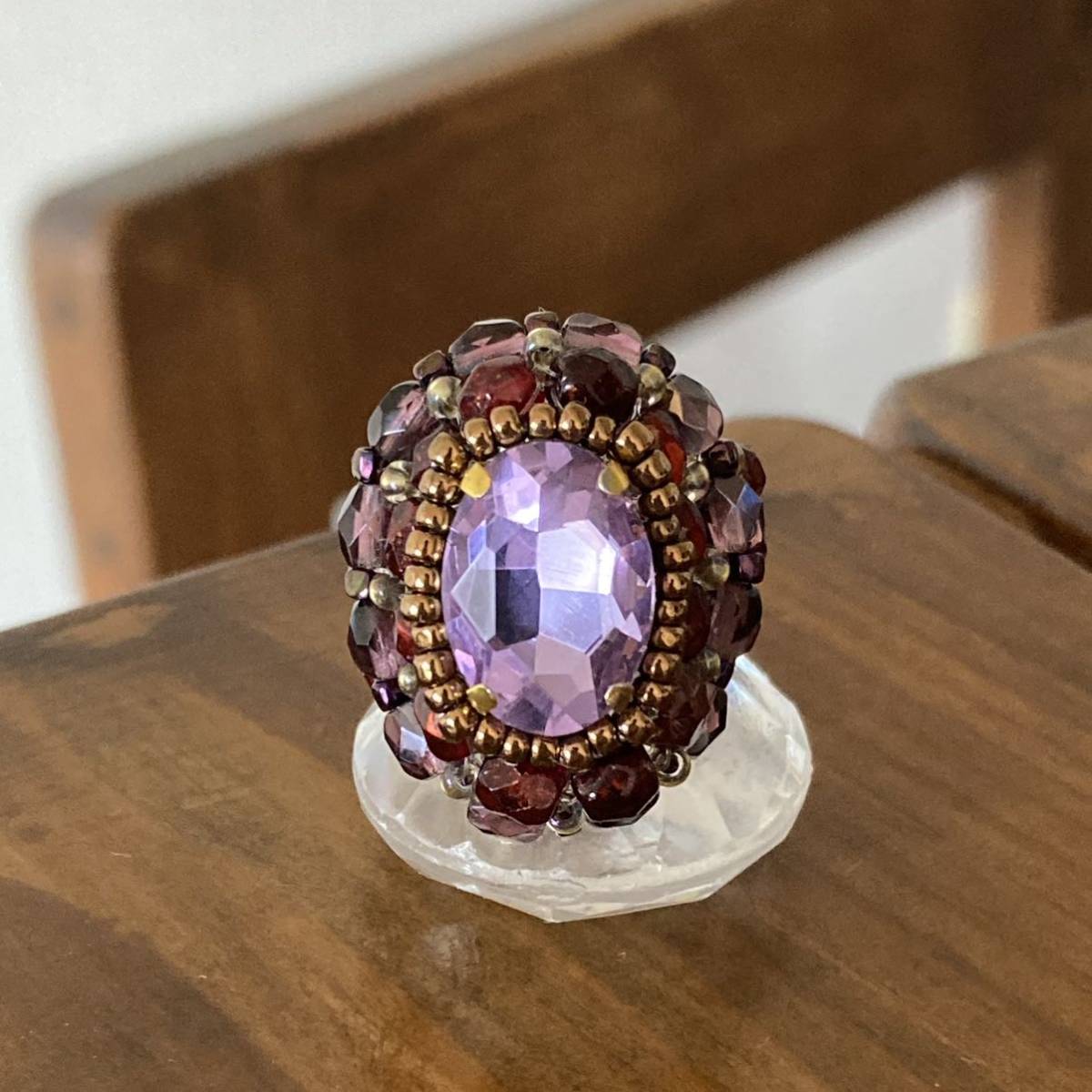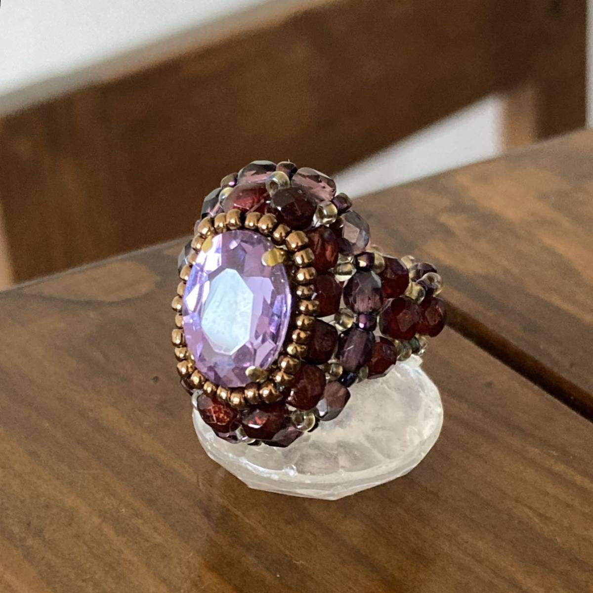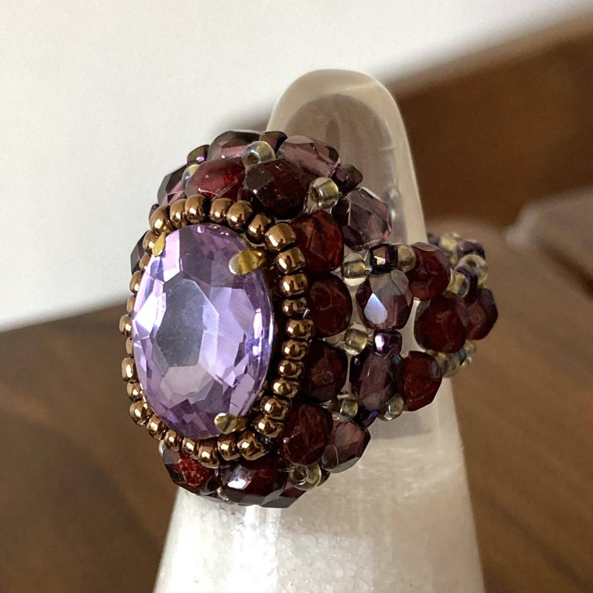 14mmの薄いパープルのオーバル型ガラスラインストーン、4mmの深い赤、パープルのチェコビーズ、ブロンズ、パープル、クリアゴールド系の丸小ビーズで作ったリングです。