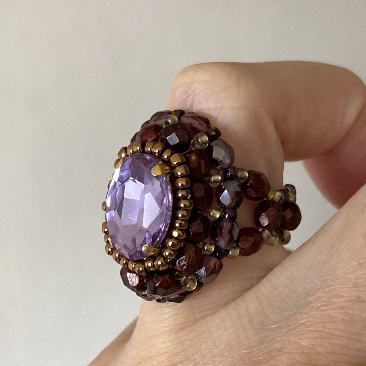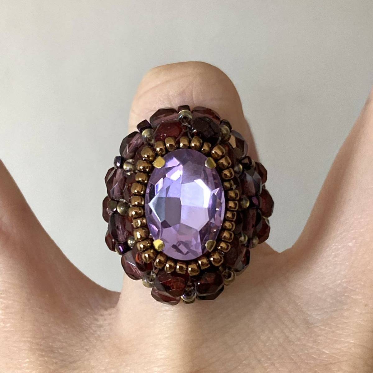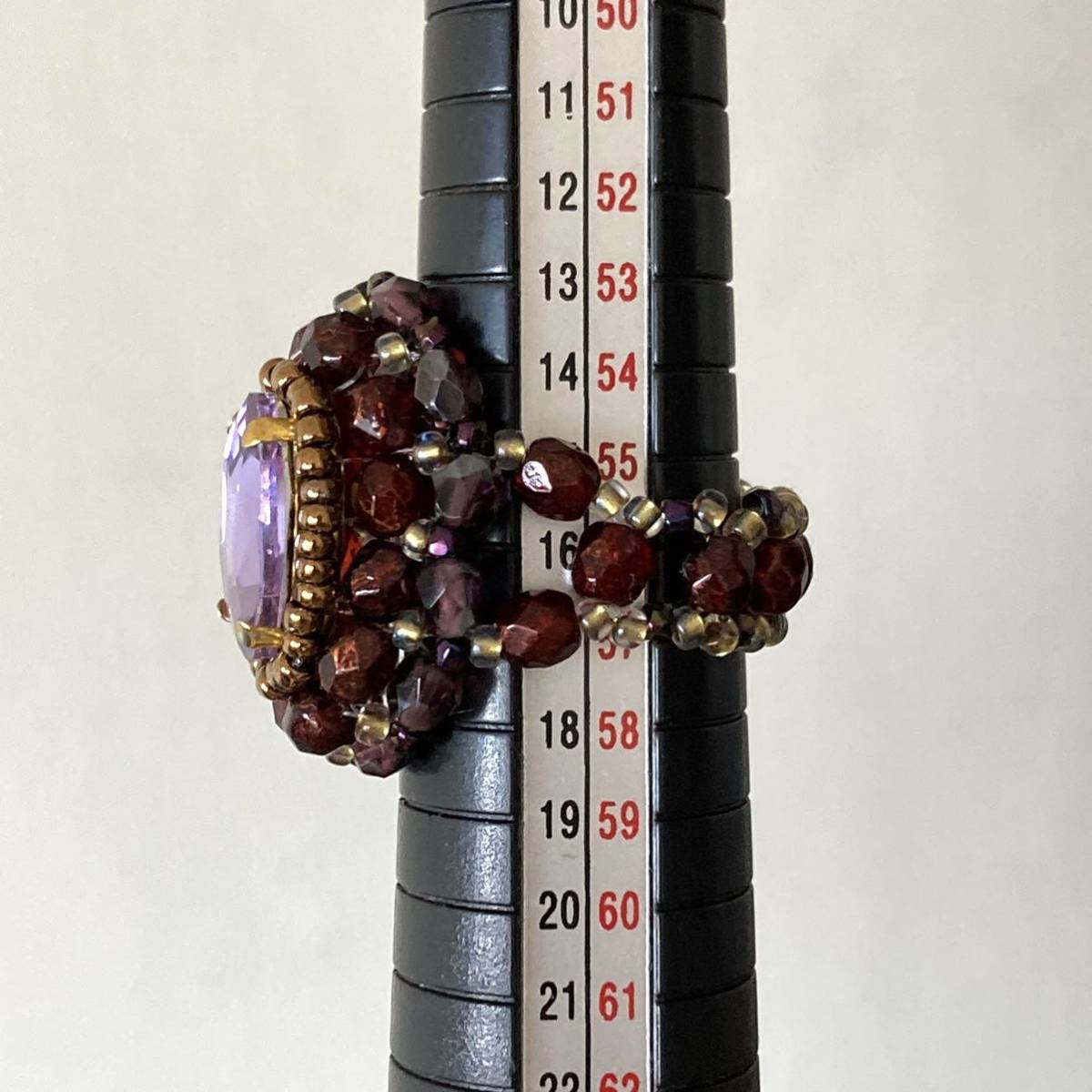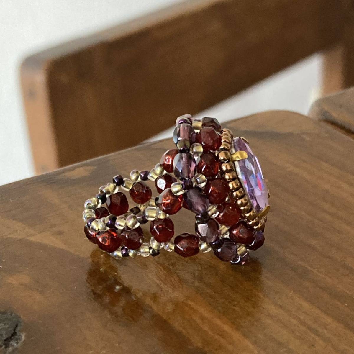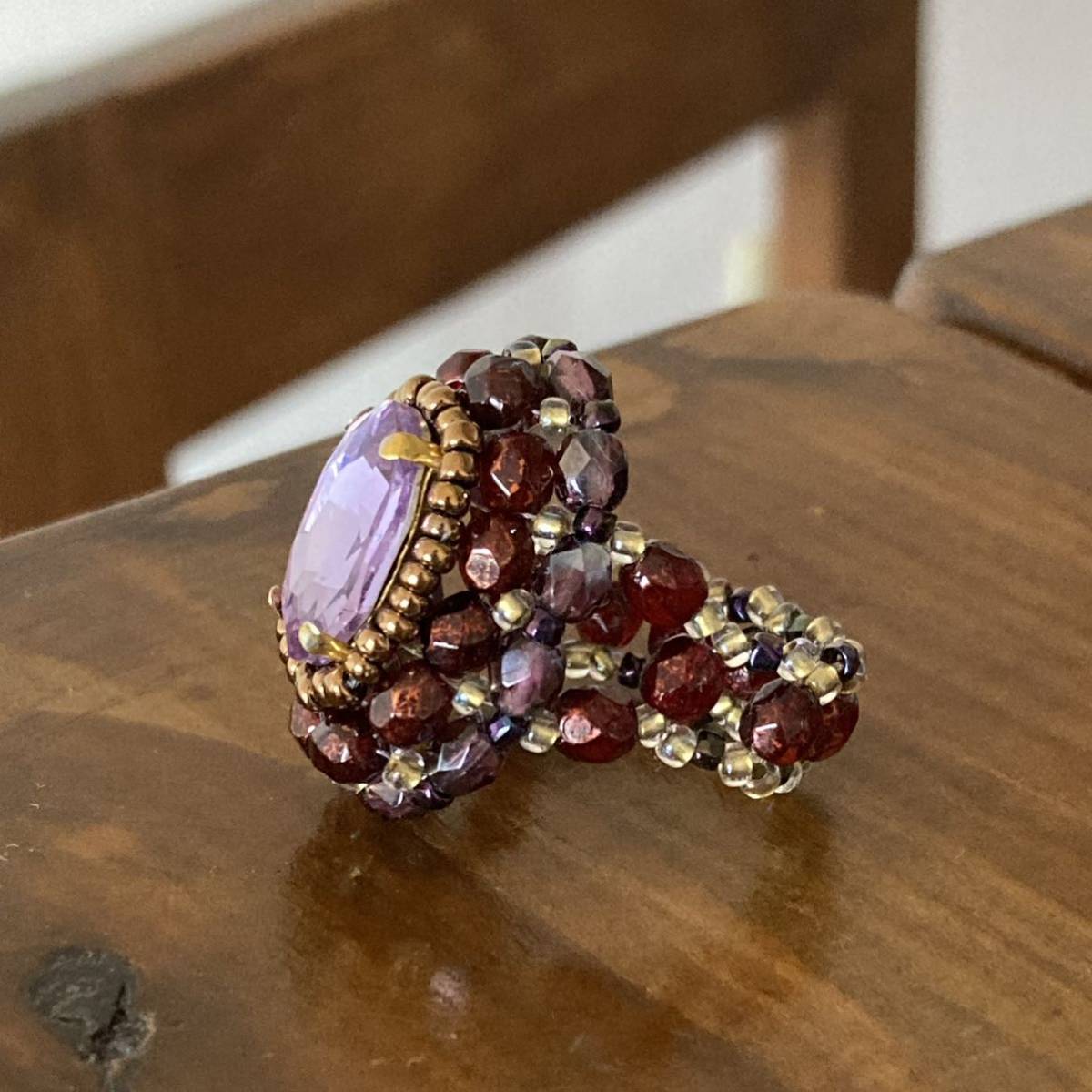 14mmの薄いパープルのオーバル型ガラスラインストーン、4mmの深い赤、パープルのチェコビーズ、ブロンズ、パープル、クリアゴールド系の丸小ビーズで作ったリングです。