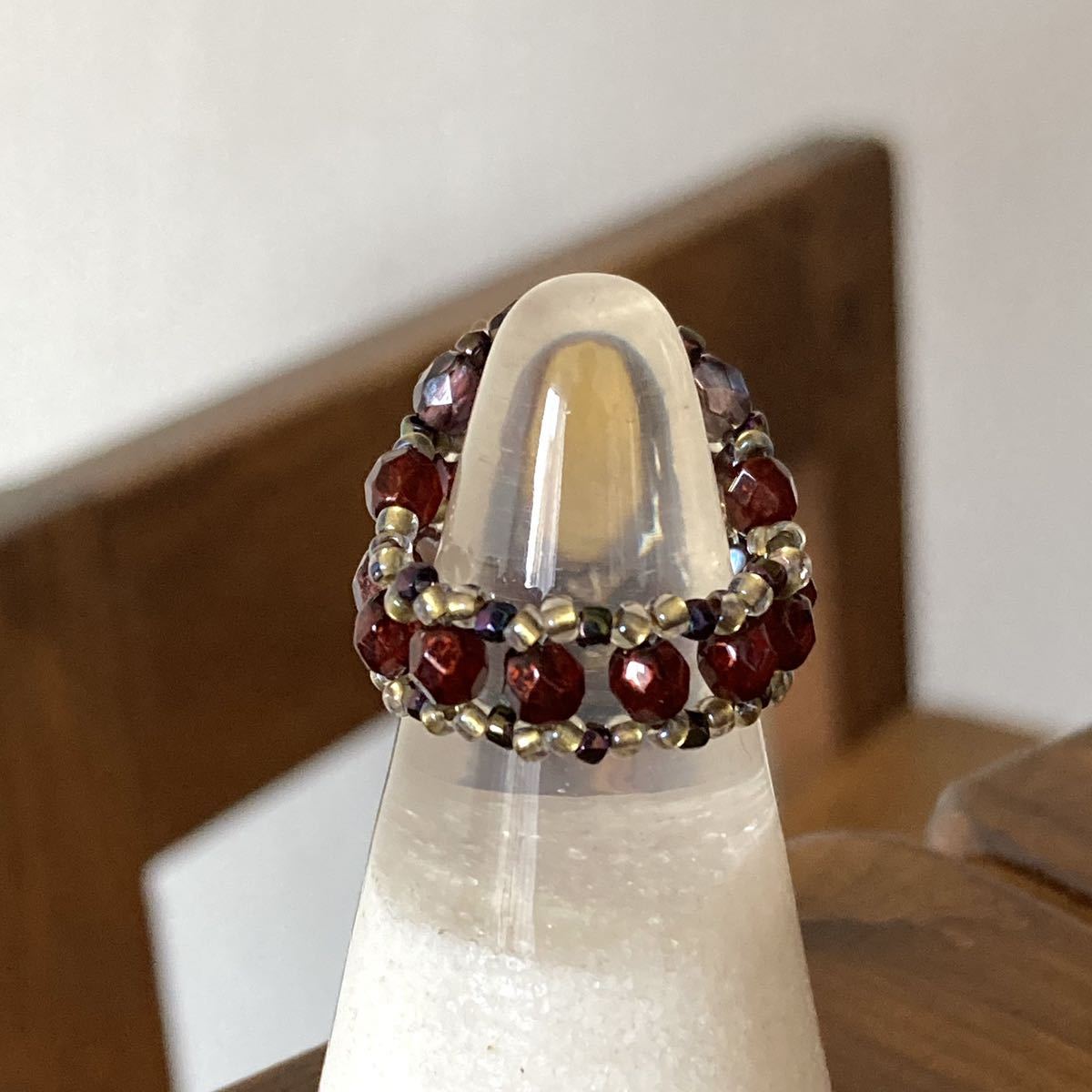 ラインストーンの周りをチェコビーズと丸小ビーズで3重に編んだデザインのリングです♪