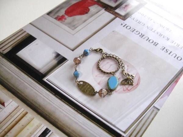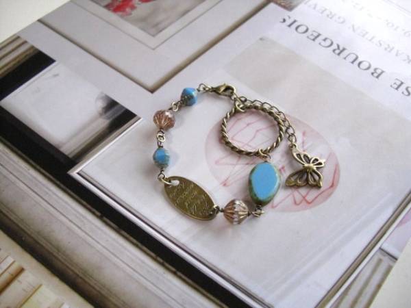 ニューヨーク・テイスト・・シリーズです♪蝶のモチーフ・・個性的なオリエンタルブルーのチェコビーズやデザインメタルやリング、蝶のチャームを合わせてニューヨーク・テイストのブレスレットです♪9ミリから20ミリ位までのチェコビーズに小さな蝶のチャームを合わせました♪長さは16センチ+アジャスター6センチで最長22センチ位です♪お揃いのネックレスも出品しています♪ハンドメイドをご理解頂いてノークレーム、ノーリターンでお願いします