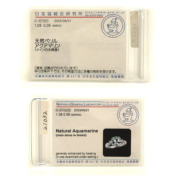 ソーティング記載 | 天然ベリル アクアマリン (メインのみ検査) 通常、加熱が行われています |