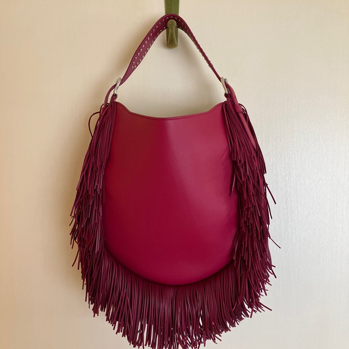 J&M DAVIDSONのバッグです。保存袋に入れたまま保管していました。ややフリンジが乱れている箇所があります。また、バッグ表面に1箇所押し付けられたような1cmほどの跡があります。付属のポーチとストラップ(保管時の折りグセがあります)もお付けします。