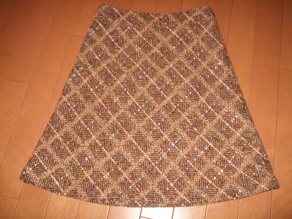良品、ハロッズのツイード風素材のエレガントで女性らしいスカートです。ツイードの中にリボンが通してあったりして、とてもかわいいです。全体的にはブラウン系の色合いのものです。表示サイズは1、素材は毛75ナイロン20レーヨン5です。裏地はキュプラになっています。ウエスト約60、丈約53.5です。ブーツなどに合わせると、まだまだ寒い冬、素敵ですし、少し春の兆しが見えてきた頃には、白系のトップスなどもよく合うかと思います。ぜひご検討ください。