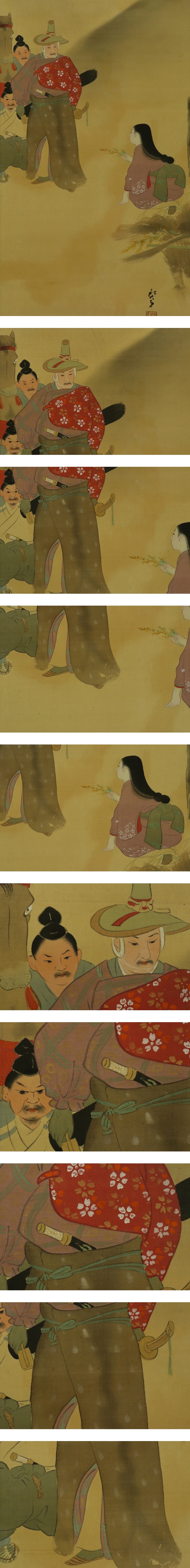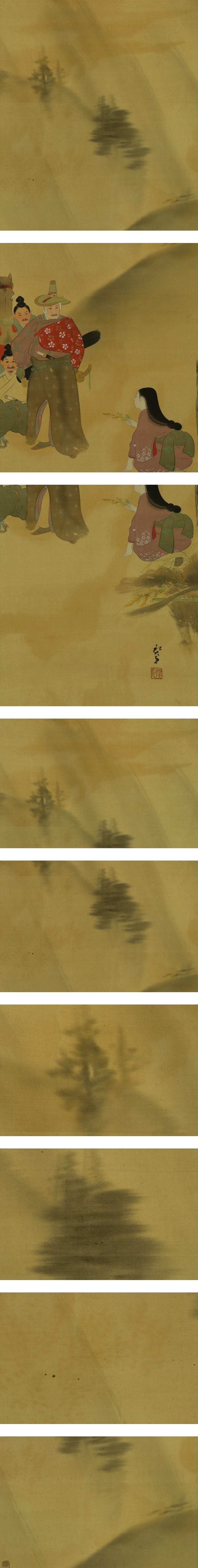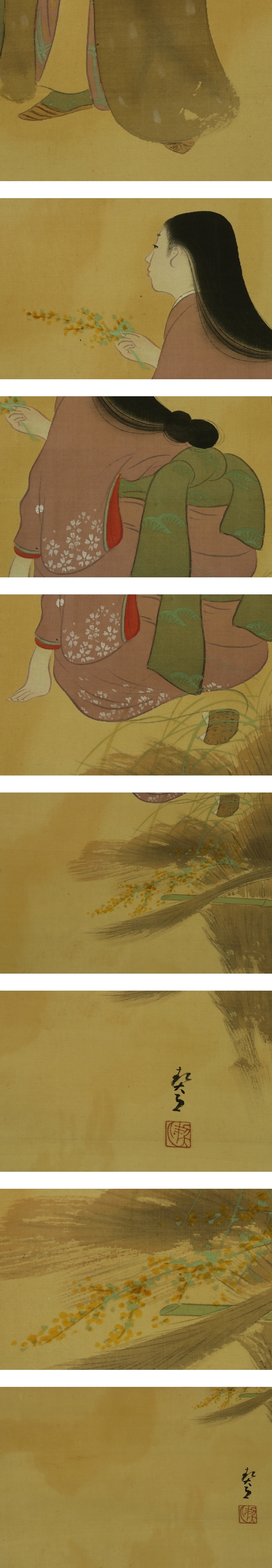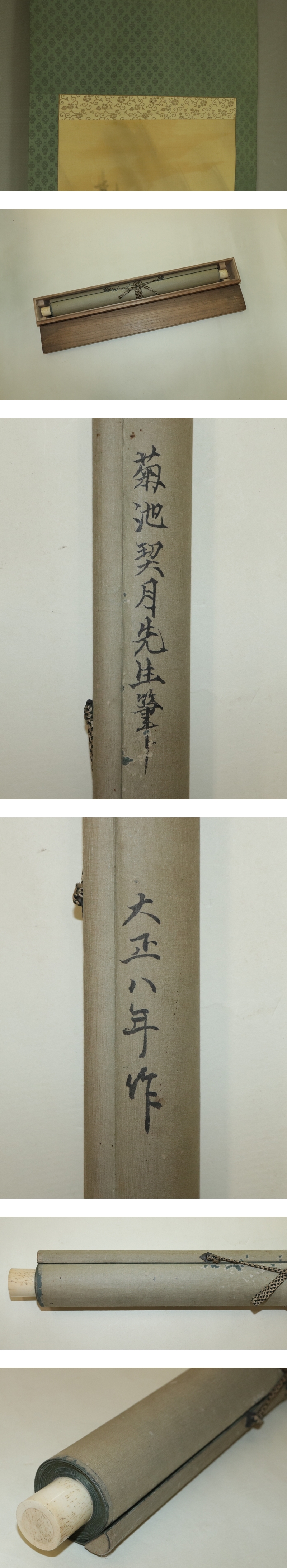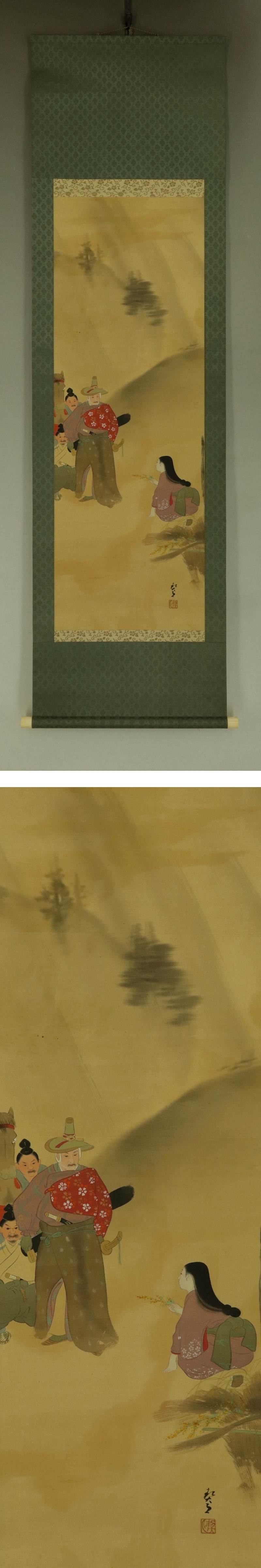 菊池契月 きくち-けいげつ(1879-1955) 日本画家。長野の生まれ。旧姓は細野、本名、完爾。 児玉果亭に学び、京都に出て菊池芳文に師事。 円山・四条派の写生風に大和絵の手法を加えた古典的風趣の歴史人物画を描き、 初期文展以来、京都画壇で指導的立場に立った。 本紙は、染み、汚れ、軽い折れ、軽い皺、ヤケがあります。 表装は、染み、汚れ、折れ、皺、虫食い、破れ、軸先にヒビがあります。 【サイズ】 作品 横約37cm×縦約109cm 表装 横約48cm×縦約173cm |