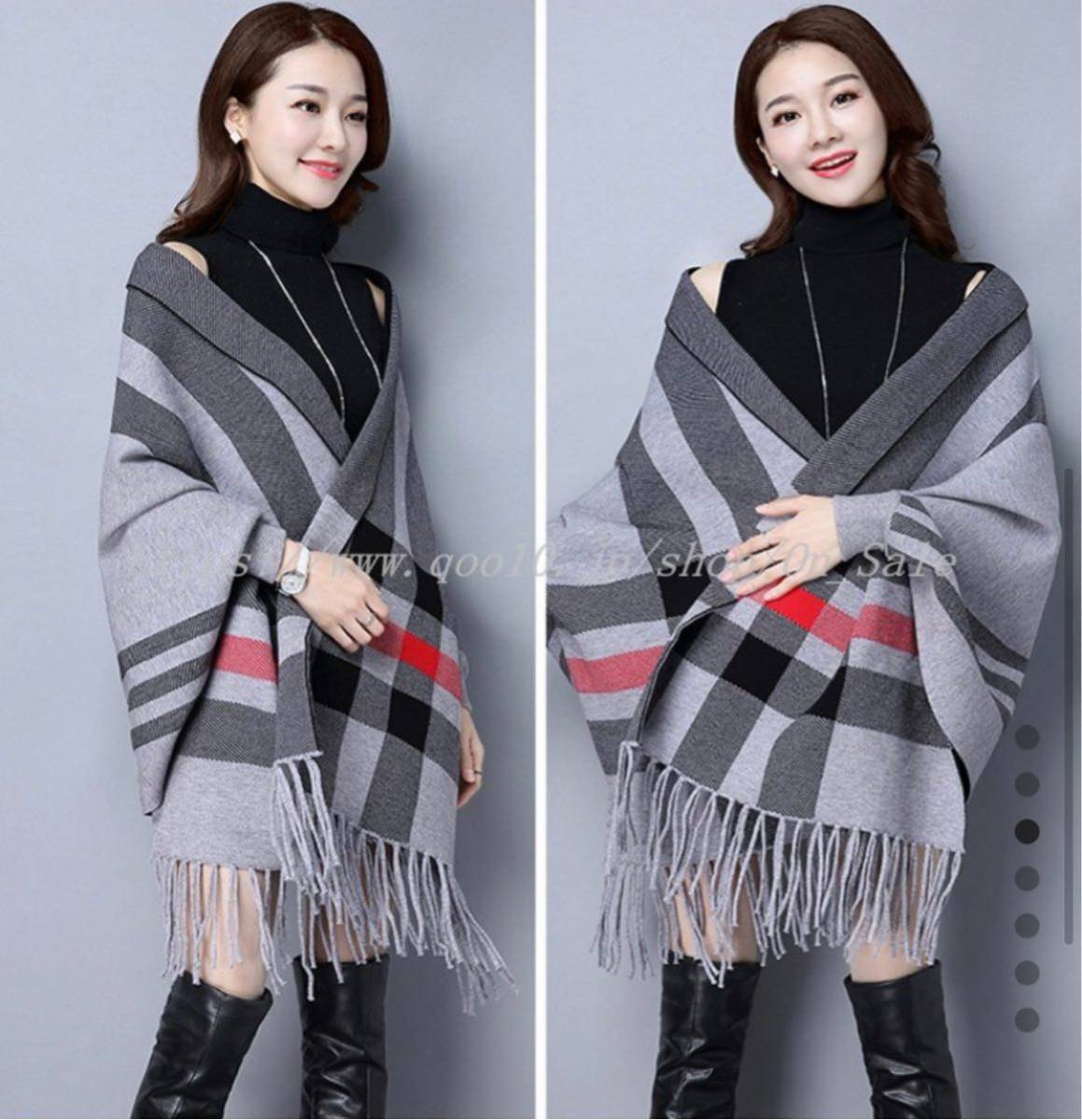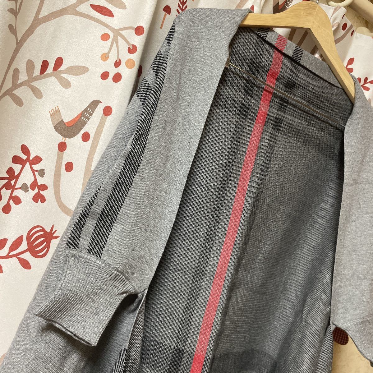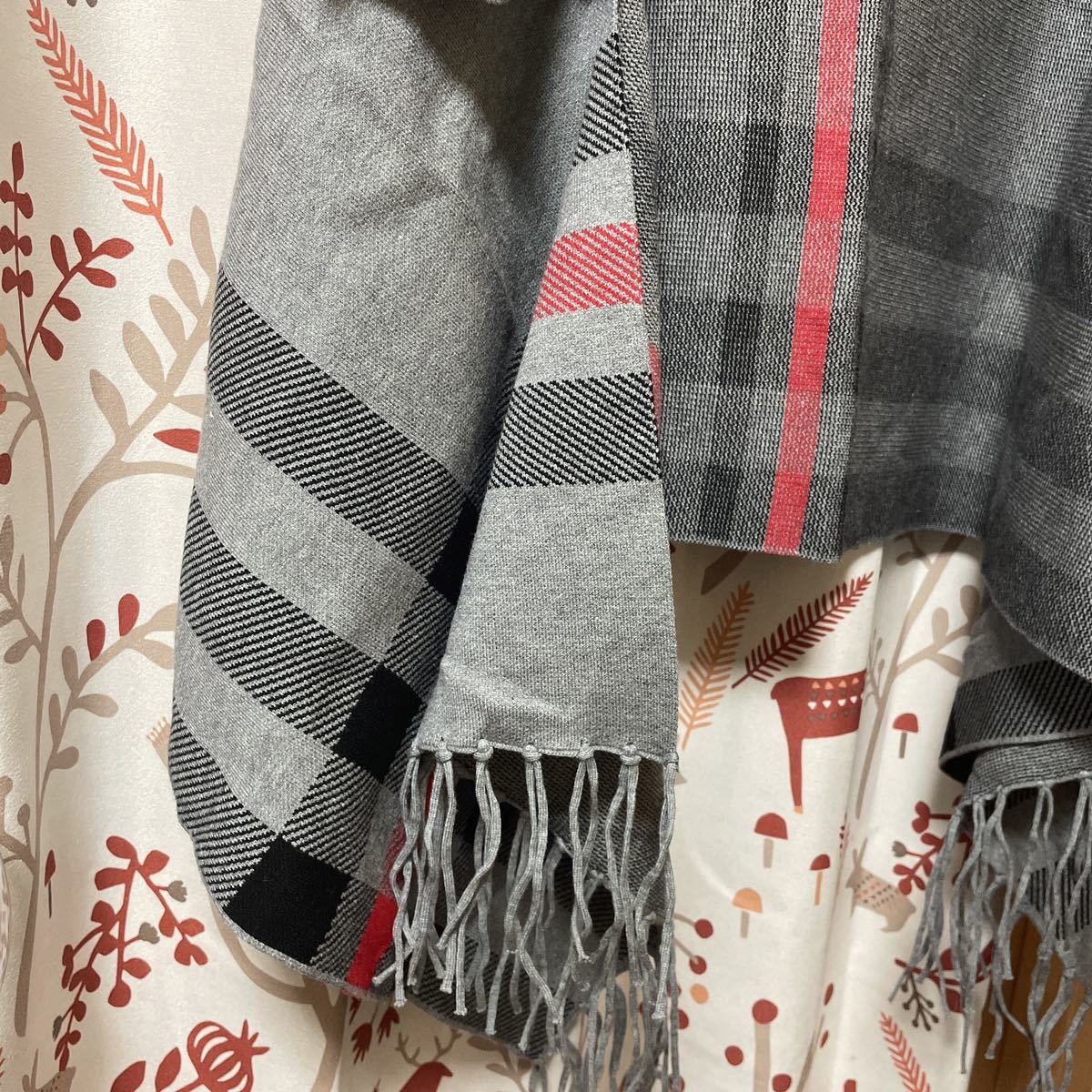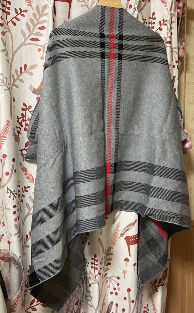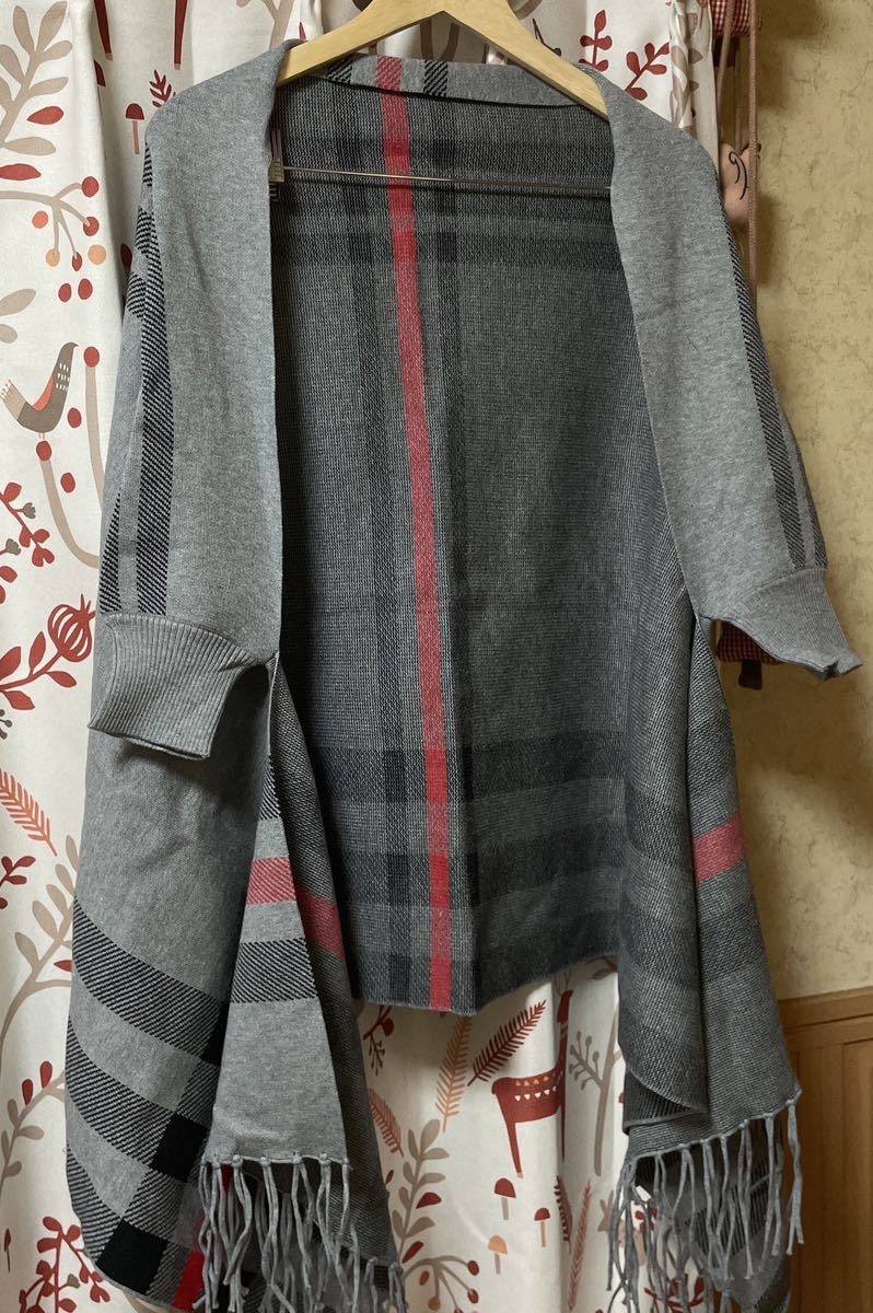 ◆約186(フリンジ約12×2)×45のストールに袖がついた変形タイプのオシャレなカーディガン♪目の詰まったストレッチニットのような素材♪チェック柄も大人可愛い
