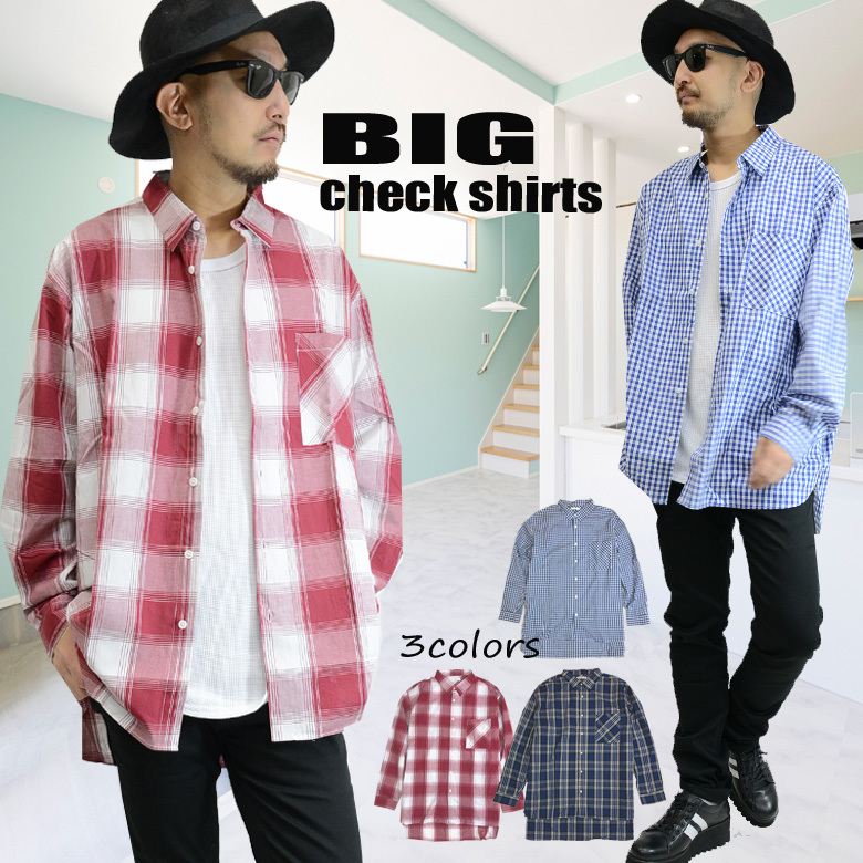長袖シャツ/ロングシャツ/チェック柄/ビッグサイズ/オーバーサイズ/