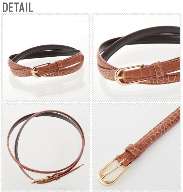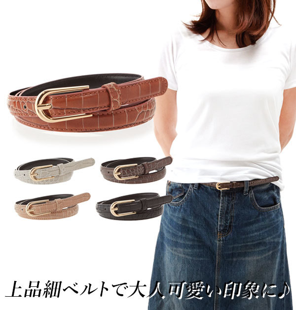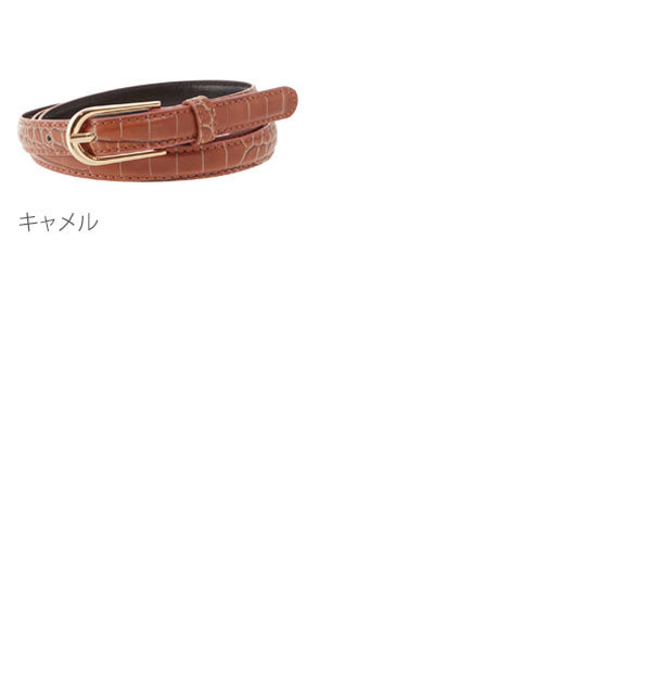 商品説明 | クロコダイルフェイクレザー細ベルトです。大人スタイルには欠かせない細めベルト♪定番でオールシーズン使えるので、コーデの強い味方になります。ファッションのアクセントや差し色に☆デニムなどに合わせてベルトループを通しても、ワンピやチュニックに合わせても可愛いですね♪ |