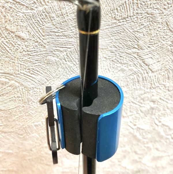 ホルダー部分にロッドを挟み、カラビナ部分をライフジャケットやベスト、バッグ、