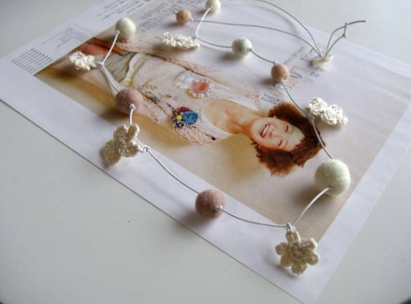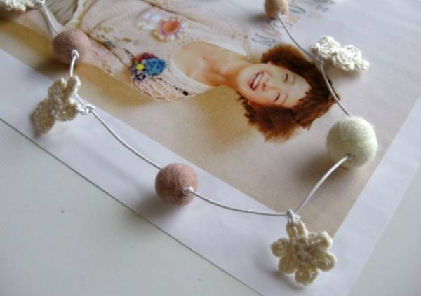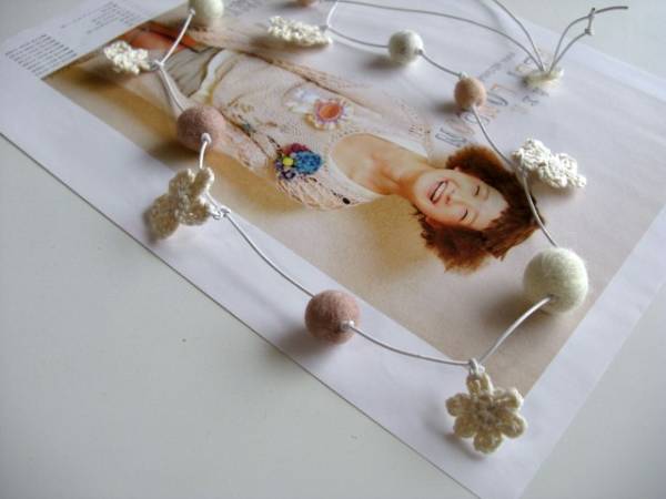 愛らしさの条件・・シリーズです♪フェルト玉マニアⅣ・・ふんわりやさしいフェルト玉のネックレスです♪サーモンピンクやベージュピンク、ナチュラルホワイトなどやさしい色のフェルト玉やホワイトベージュの編みフラワーを白のレザーコードに紡いでキュートな表情です♪フェルト玉は10ミリから20ミリ位までの大きさ違い、編みフラワーは20ミリから30ミリ位の大きさ違いです♪長さは95センチ位で調節自由です♪お揃いのブレスレットやイヤリングも出品しています♪ハンドメイドをご理解いただいてノークレーム、ノーリターンでお願いします♪