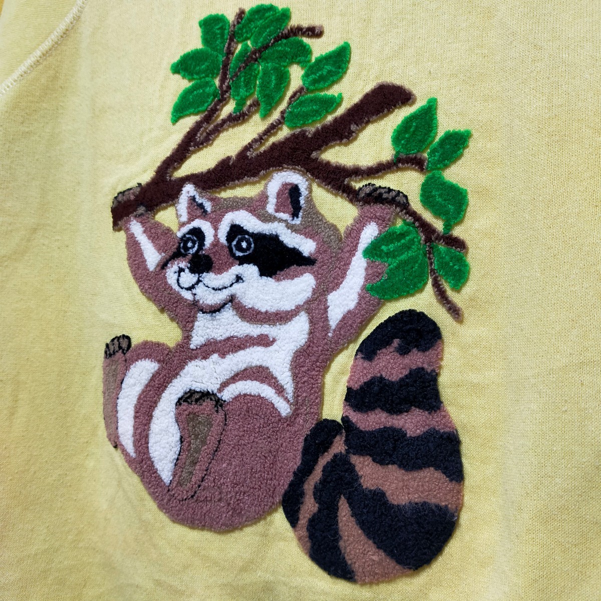 カラーはイエロー、フロントにアニマルデザインのサガラ刺繍が入っています。