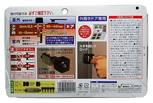 ディンプルキータイプ・ブラック N-2426・・Color:ブラックPatternName:単品・仕様:外開き1枚ドア専用。・色:ブラック・取付可能寸法:ドア厚35~42mm・3mm以上、ドア枠5~65mm・10~15mm・穴を開けなくても、ドアに傷を付けなくても玄関ドアに2つ目のロックを増やせます。・特長:施工の必要無し。後付けで2つ目のドアロックが付けられる。説明 ドアに傷を付けず2つ目のロックを増やせる 防犯性の高いディンプルキー 取付可能寸法:ドア厚35~42mm・3mm以上、ドア枠5~65mm・10~15mm