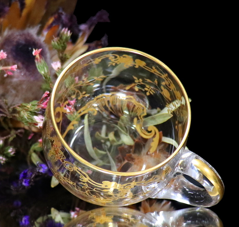 バカラやサンルイにはこうしたロココ装飾をモチーフとしたシリーズがいくつかあり、こちらはその中でも高い人気を誇る金彩があしらわれたグラスとなります。