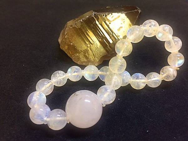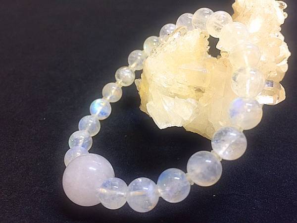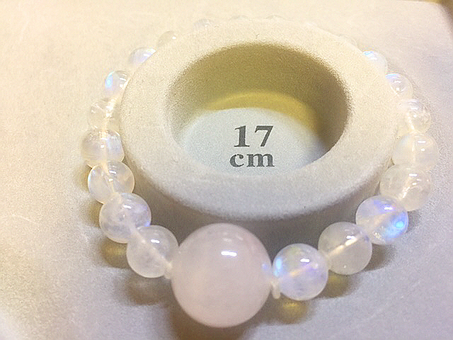 高品質なノースカロライナ産の大玉アゼツライトを中央に、最上級のレインボームーンストーンを使って作成しました。可愛いブレスレットです☆