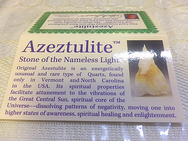 ~この石の名称は、惑星の目覚め(進化)を促すためグループで働いている「アゼズ」に由来しています。 「アゼズ」は宇宙の核であり根源的な光の源であるグレードセントラルサンの「名無き光」を私達に届けるため、 その偉大な容量を保持できるようにこの石を統計したのです。 アゼツライトを身につけ、共に眠り、共に瞑想することは、その大きなスピリチュアルギフトを受け取ることに、 自分自身を開いていくことにつながります。 アゼズを迎え入れ、自分自身を救うその光を受け取ることはとても重要です。 アゼツライトが持っている可能性は、世界を目覚めさせることです。 私達は今、世界の魂と共に神聖な光の通路として自分自身を開いていく機会を与えられているのです。