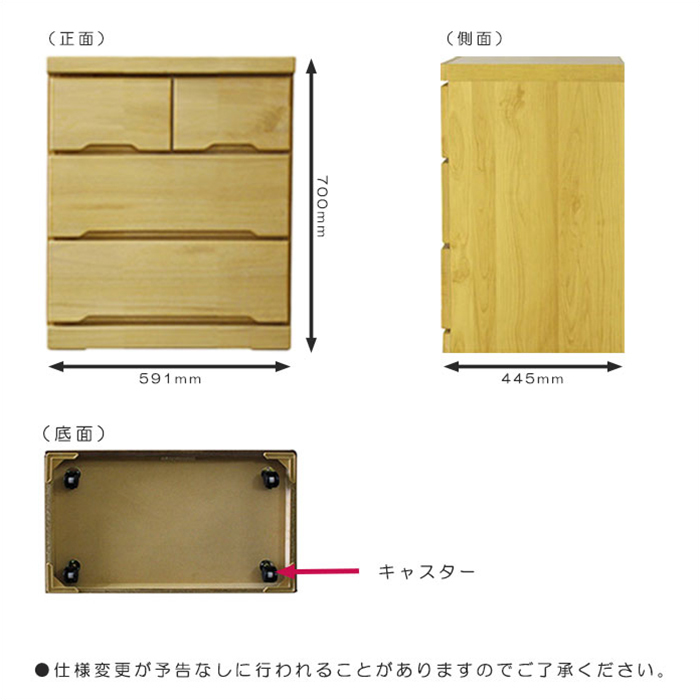 特  徴幅59cm桐材を使った、国産ローチェストです。引き出しは頑丈な箱組み。取り付け式の隠しキャスター付きです。