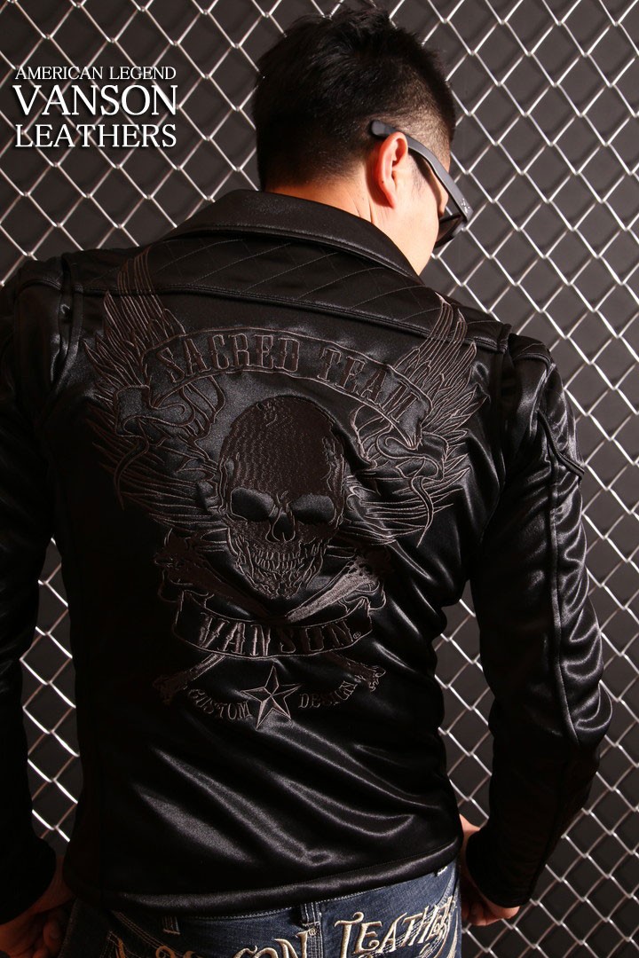 当店別注 バンソン VANSON ボンディング ダブルライダース ジャケット ACV-701 ブラック×チャコール刺繍【Mサイズ】刺繍 ドクロ スカル