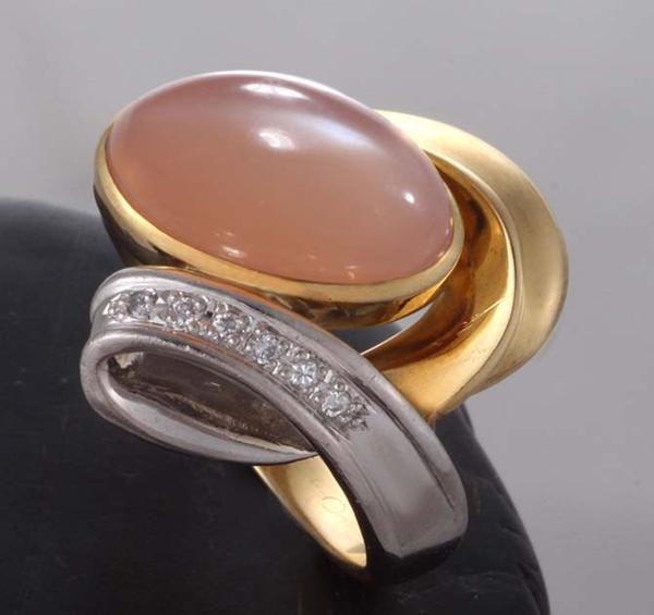コメント | [[全ての商品に品質保証カードが付きますのでご安心ください]] 大型でオレンジとピンクが融合した色合いのムーンストーン、8.64カラットです。 単光源が当たるとキャッツアイが出現します。 ダイアは全部で6石、合計0.06カラットの刻印があります。ゴールドのリングですが、一部にプラチナ900を使った贅沢な造りです。 |