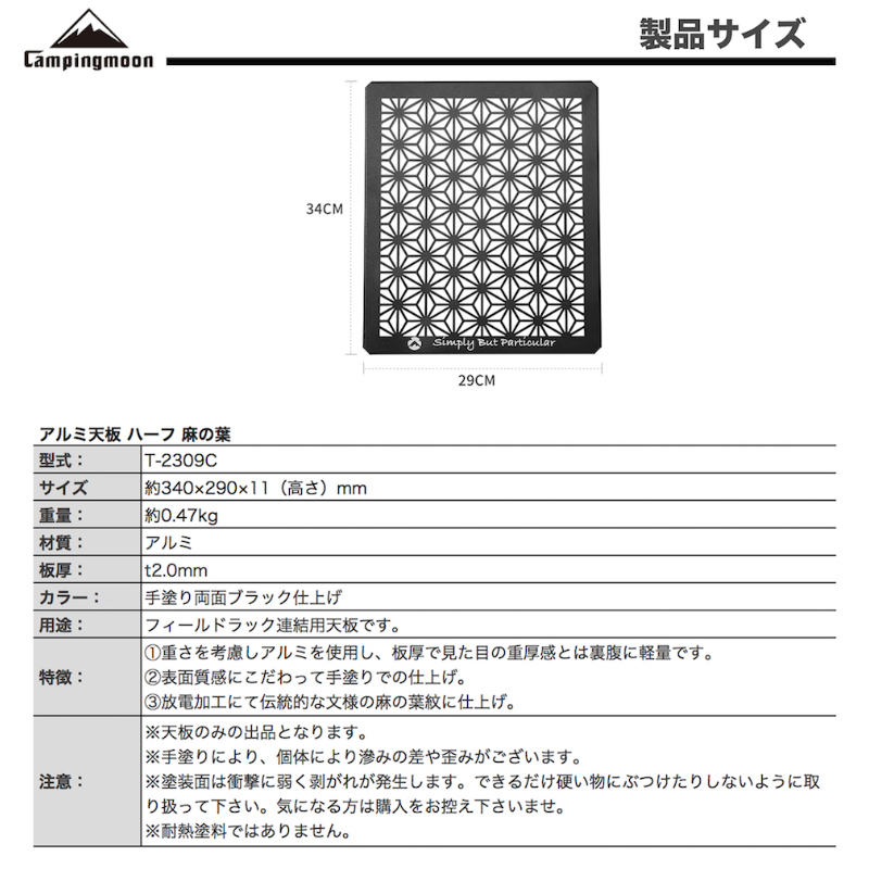 ★キャンピングムーンからフィールドラック連結用 アルミ天板 T-2309-Cになります。放電加工にて日本の伝統的な麻の葉文様に仕上げています。 ★天板を追加することで、フィールドラックを簡単にテーブルへ変身し、カスタマイズできます。お皿や水気等が出るクーラーボックス等を置いたりできます。 ★ハーフサイズであり、用途に応じて使い分け、それぞれの風合いを楽しむことが可能になります。 特徴: (1)重さを考慮しアルミを使用し、板厚で見た目の重厚感とは裏腹に軽量です。 (2)放電加工にて日本伝統的な麻の葉文様に仕上げています。 ★2つフィールドラックを使うことで、少しでも天板の長さを有効に使いたい方や、アルミ天板 T-2308 と組み合わせて、連結用天板を活かした使い方、棚板使いとしても、おすすめです。 ★2つフィールドラックを少しでも長めで使いたい方や、アルミ天板T-2308を使い連結用天板を統一したい方におすすめです 商品仕様 ★品番: T-2309-C ★サイズ:約340×290×11mm ★重量:0.47㎏ ★厚み:約2.0mm ★材質 : アルミ ※天板のみの出品となりますのでご注意ください。 ※手塗りにより、個体により滲みの差や歪みがございます。加工には十分気をつけておりますが、よく見ると微細な傷があります。また、塗装面は衝撃に弱く剥がれが発生します。できるだけ硬い物にぶつけたりしないように取り扱って下さい。気になる方は購入をお控え下さいませ。 ※耐熱塗料ではありません。 ※切断面は丁寧にバリ取り仕上げ済みです。 ※細部のデザインは製造ロットにより予告なしに若干変更になる場合がございます。 何卒ご了承願います。 ※海外輸入品に付きスレ、キズ等がある場合がございますので、何卒ご了承願います。 | |||