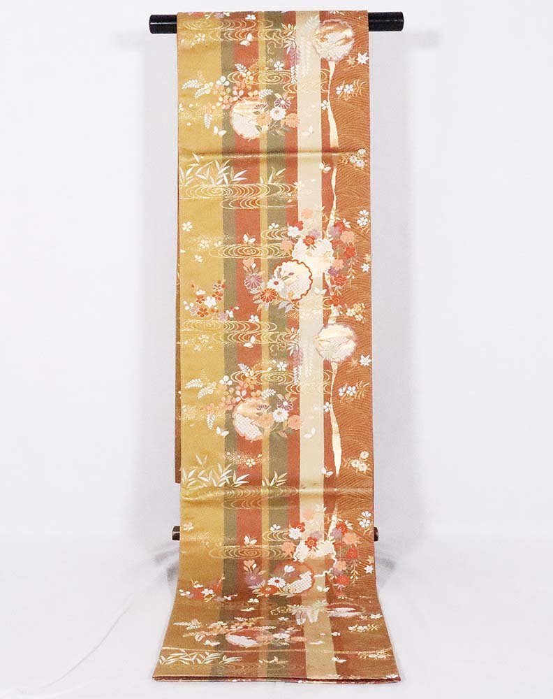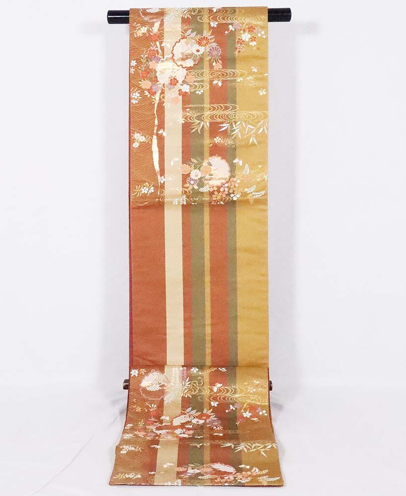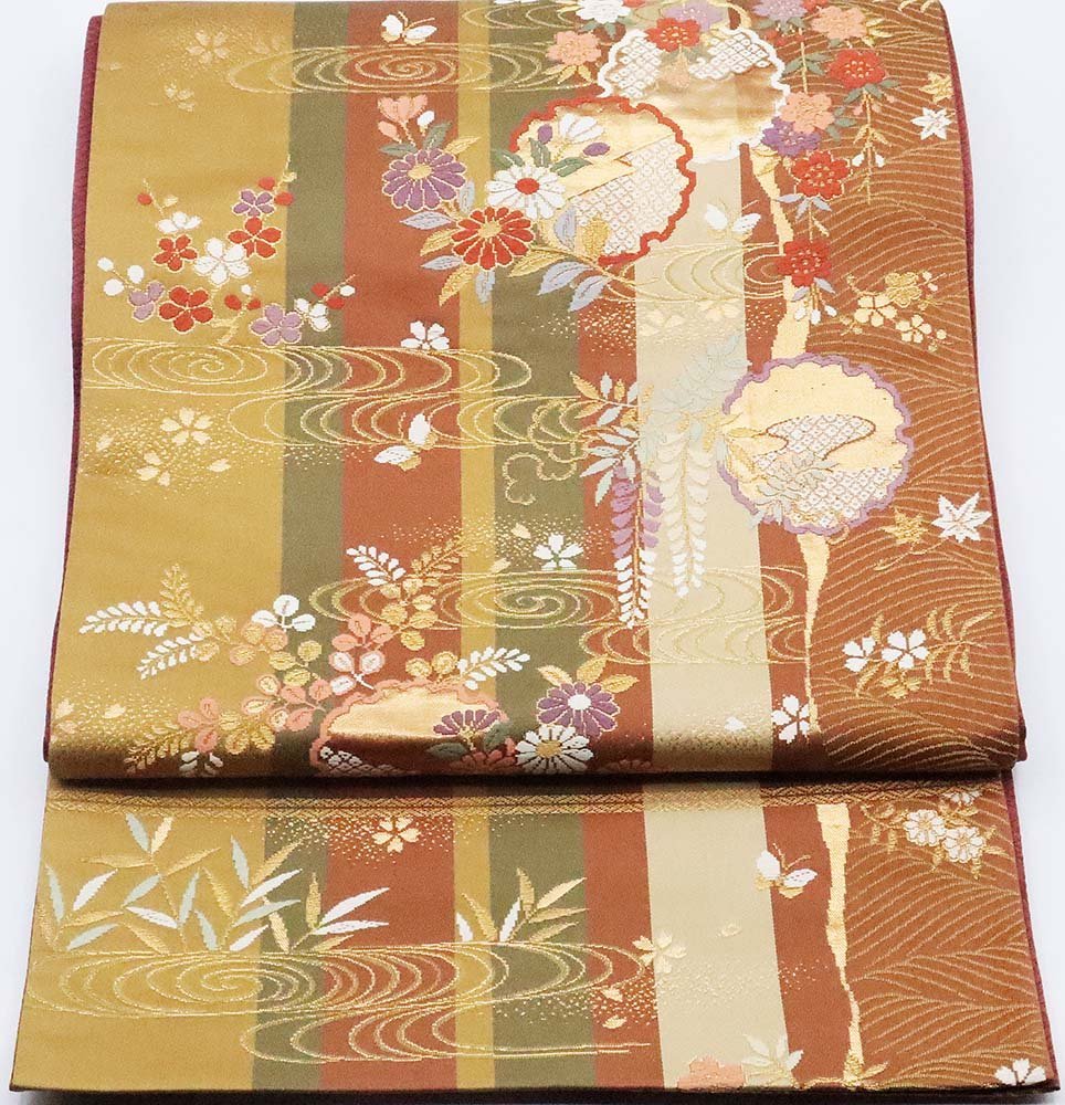 | 西陣織袋帯 茶色・ベージュ・赤・緑・黄土色・縞地 雪輪紋 桜・菊・藤・紅葉・萩・笹 未使用品 仕立て上がり | |
