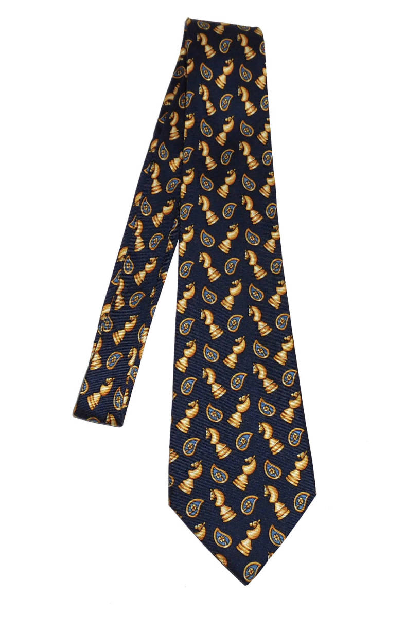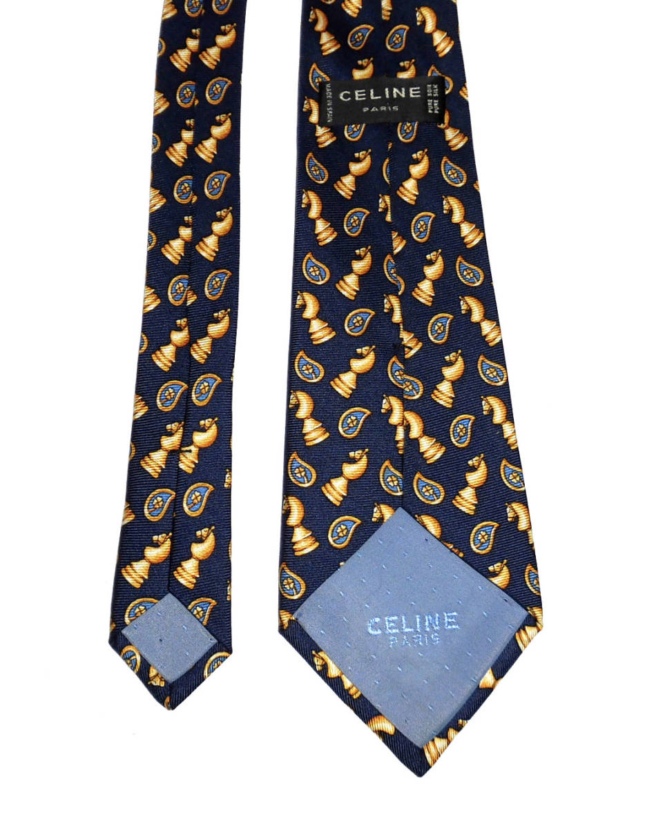 美品 CELINE セリーヌ チェス ナイト柄 シルク ネクタイ ネイビー