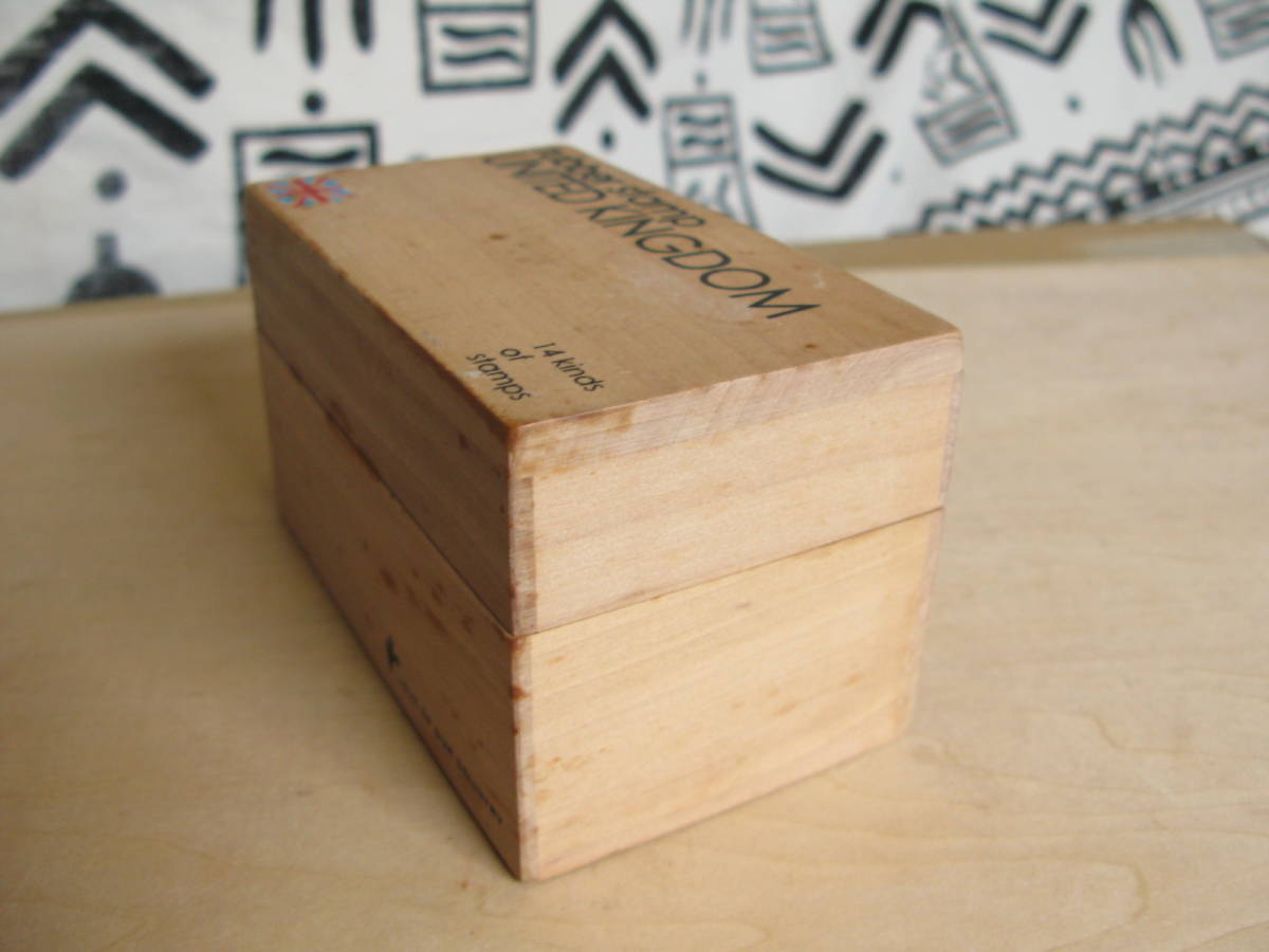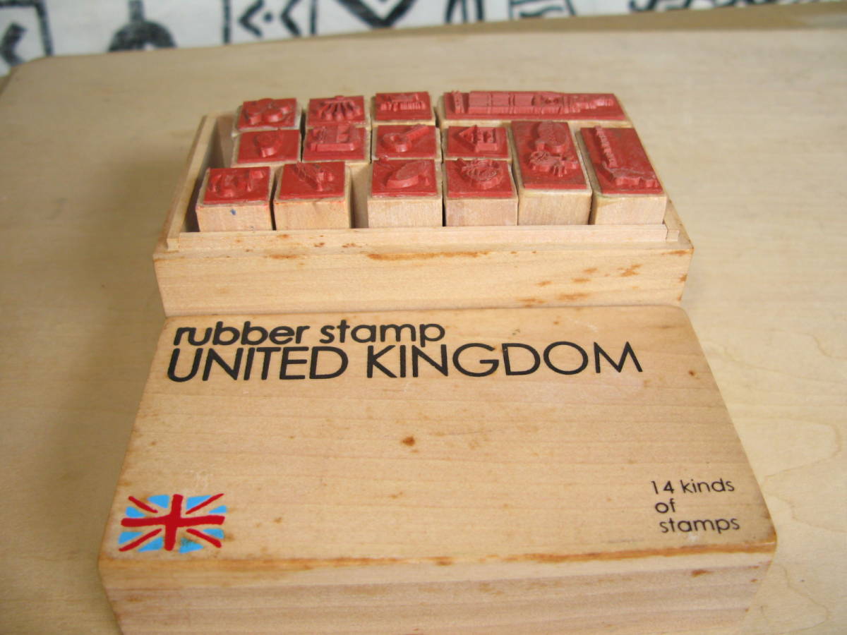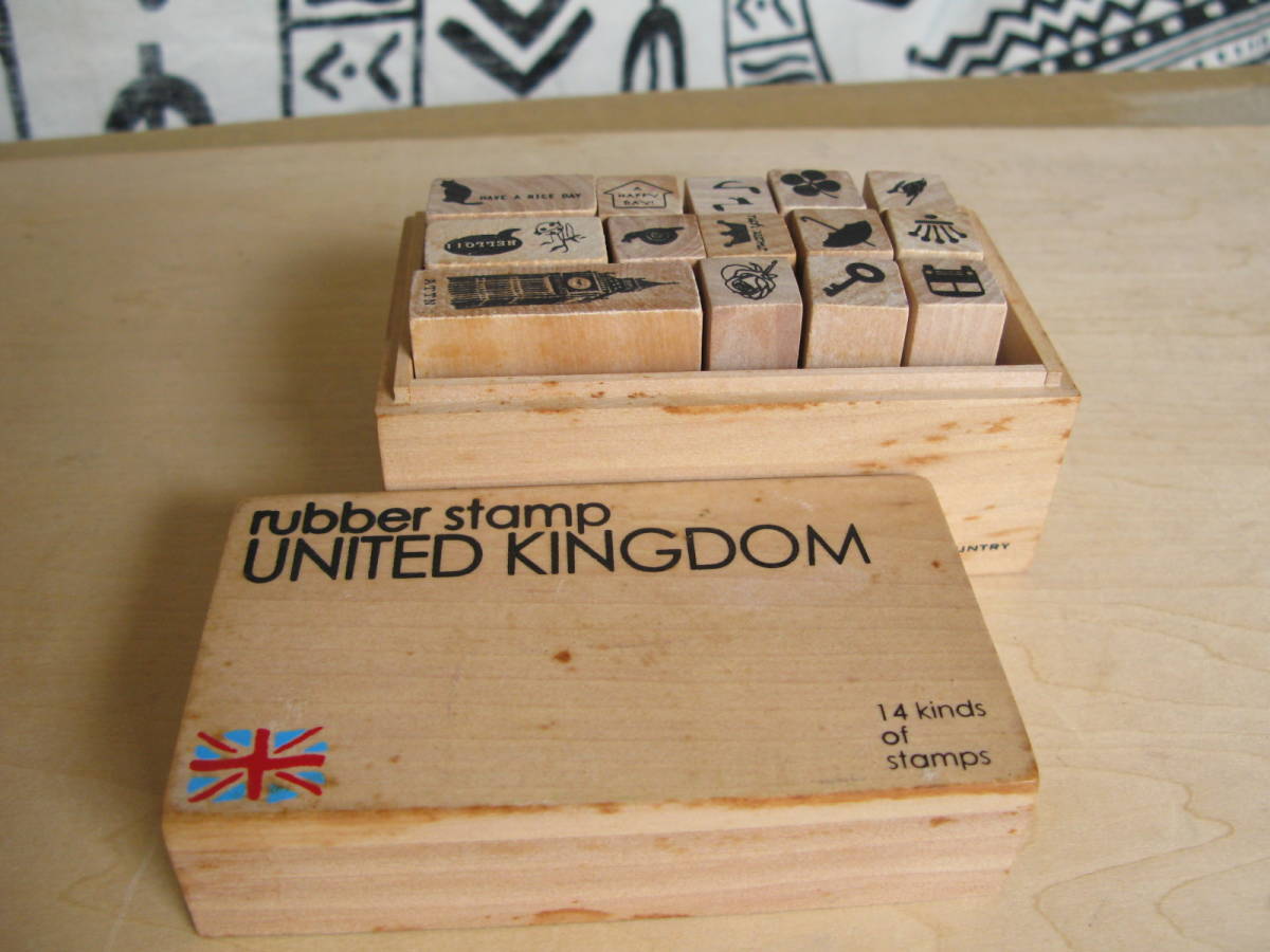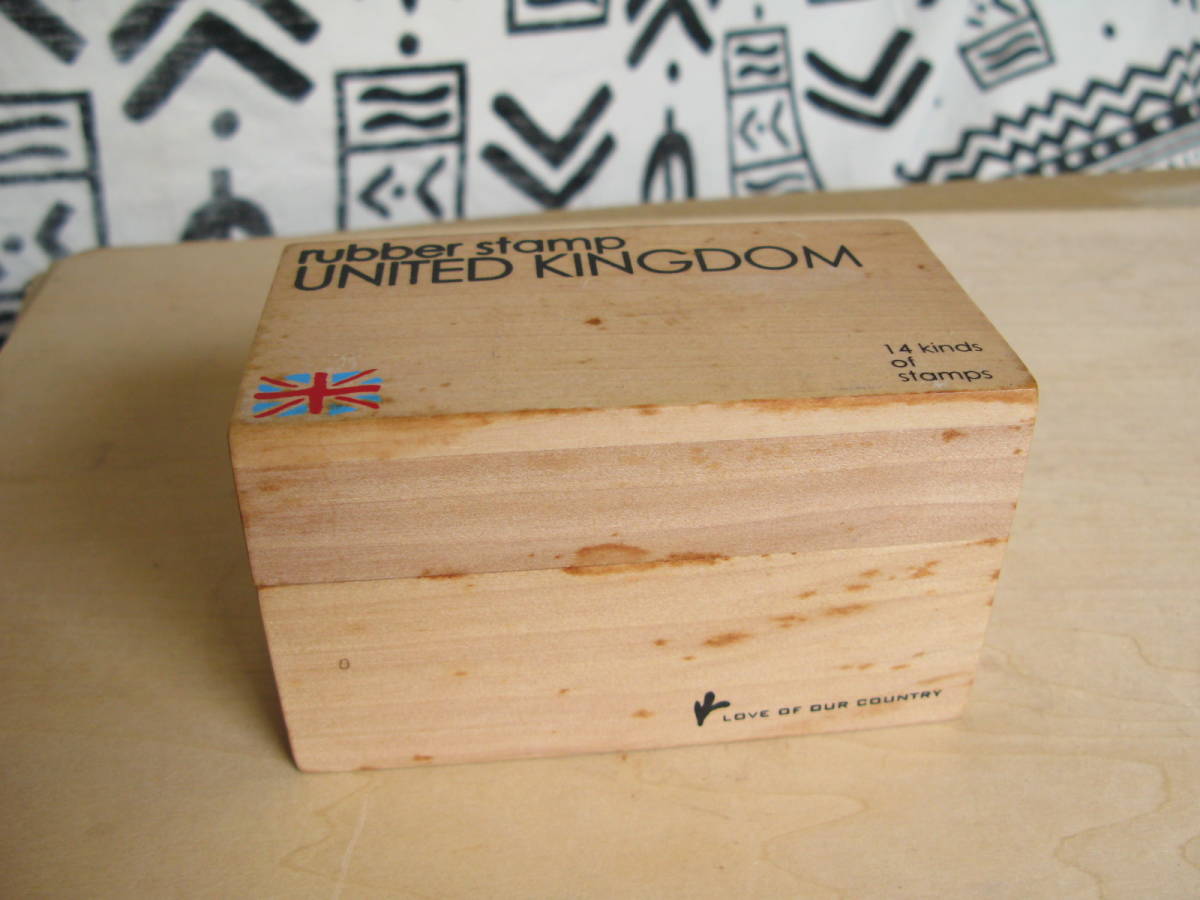 ラバースタンプ14種類 木箱入り UNITED KINGDOM ヴィンテージ箱サイズ約11.5x6.5x6.8cm (s325)