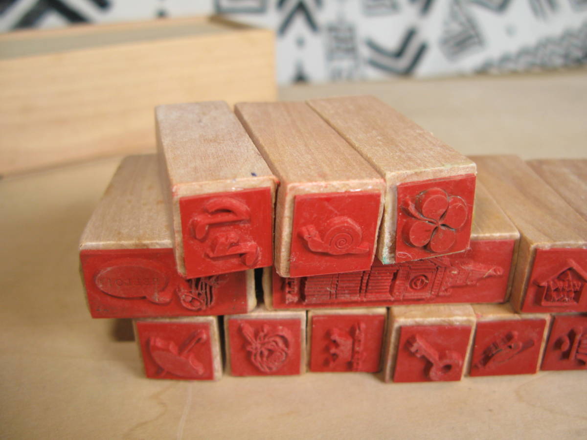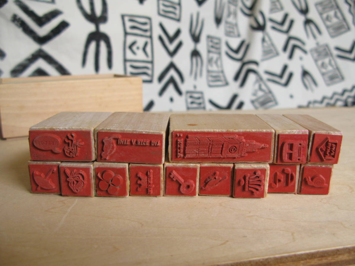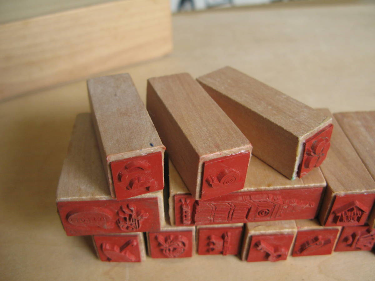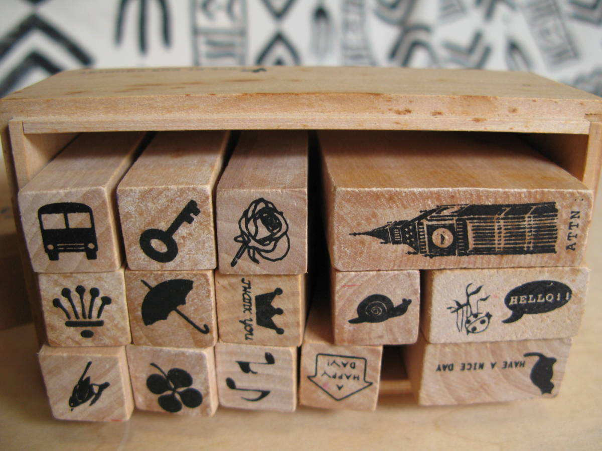 ラバースタンプ14種類 木箱入り UNITED KINGDOM ヴィンテージ箱サイズ約11.5x6.5x6.8cm (s325)