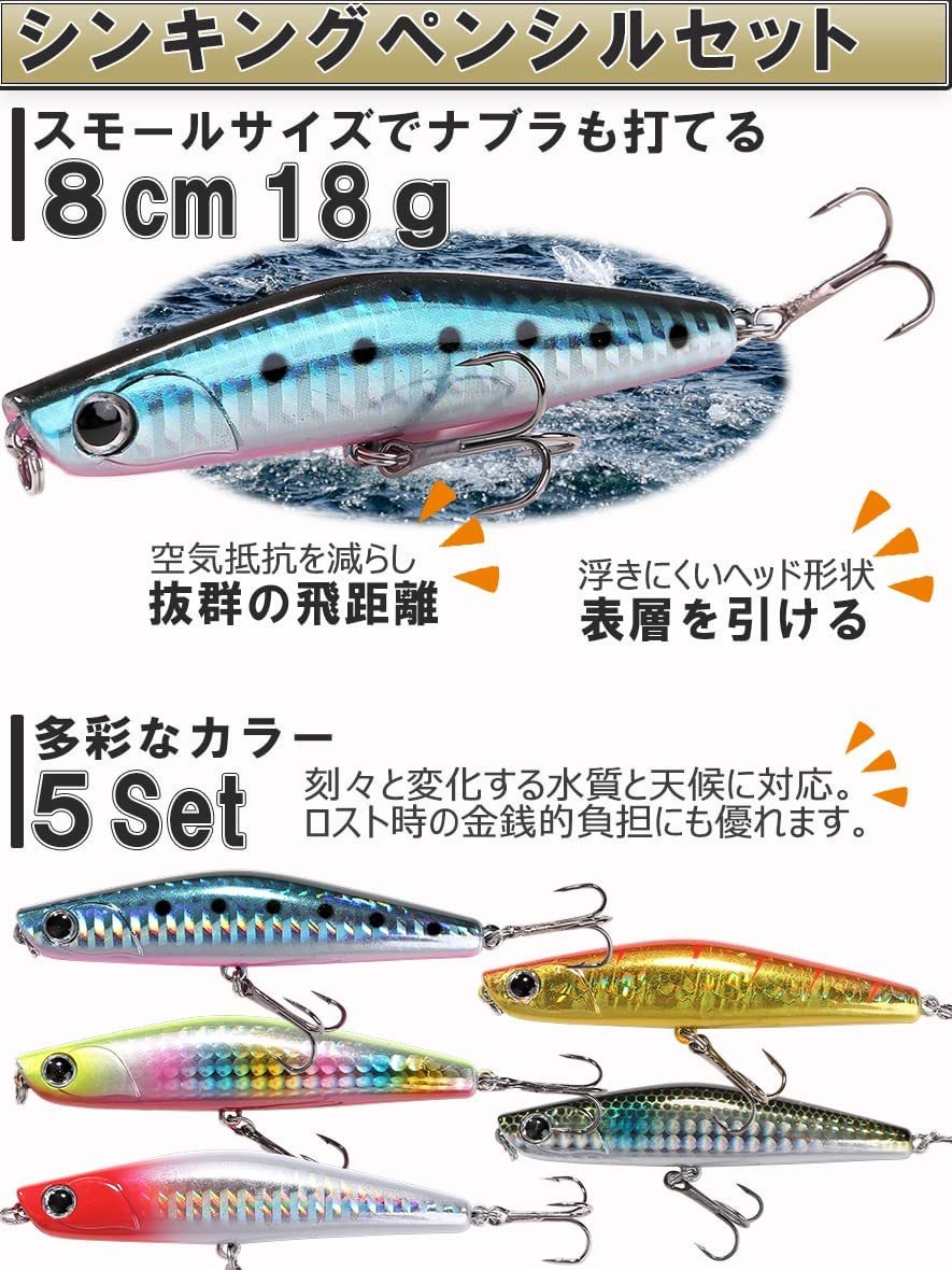 抜群の飛距離性能 お得な5個セット 新品 シンキングペンシル ルアー シーバス 青物 メバル アジ 海釣り 万能ルアー 釣り具 フィッシング