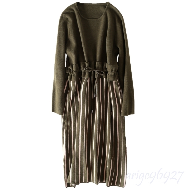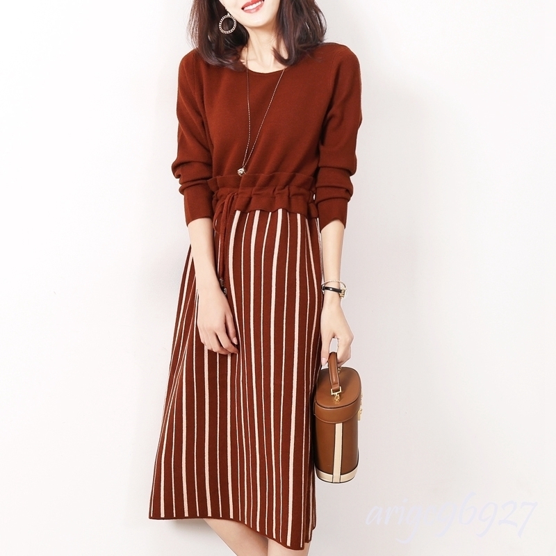 G996★ニットワンピース ロング レディース きれいめ ストライプ 秋 冬 長袖 膝下 上品 きれいめ 着痩せ