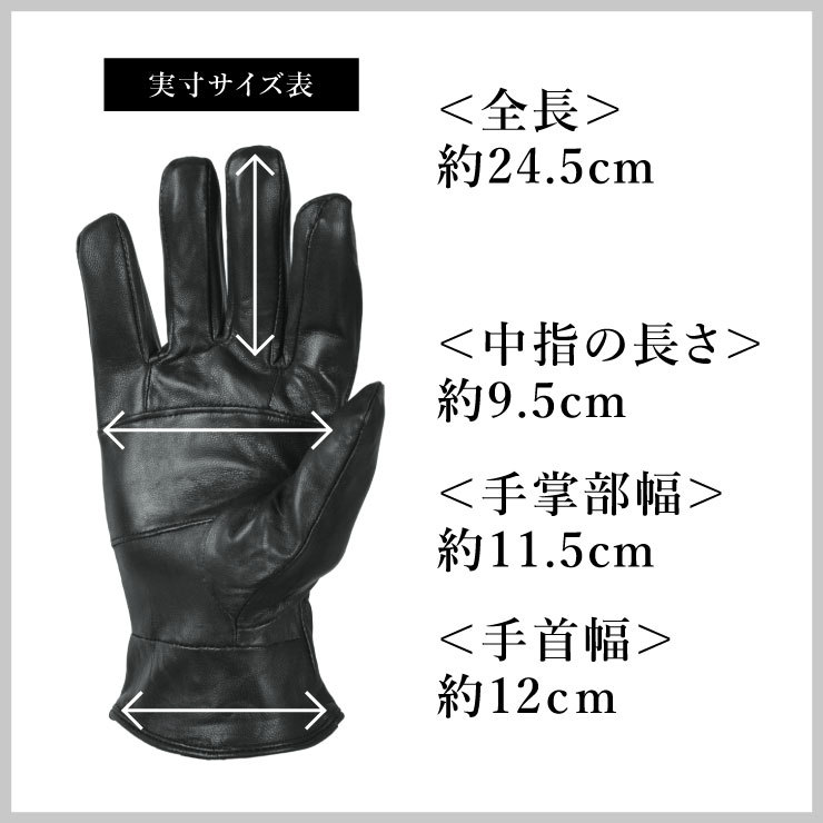 ●実寸サイズ/全長が24,5cm、中指の長さが9,5cm、手掌部幅11,5cm、手首幅12cm
