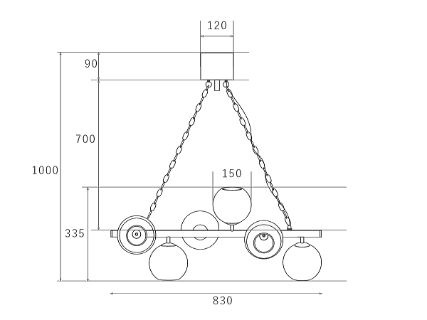 | ■幅830×高さ335(全高1000)mm 約2.9kg ■シェード:直径150mm ■対応電球 E26/40W×6球(付属) *LED球使用可能です。 |