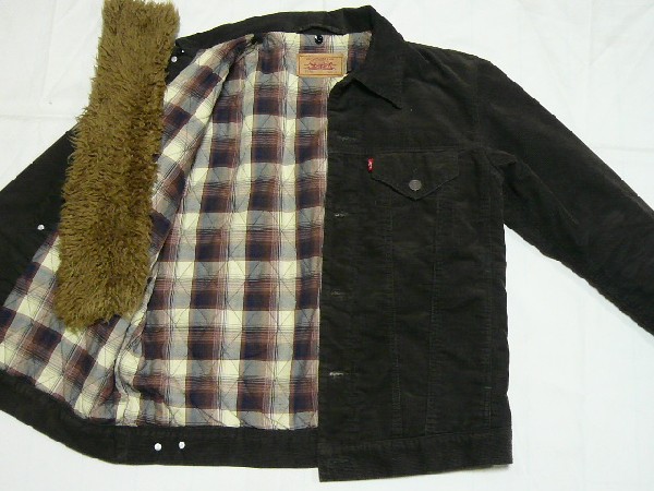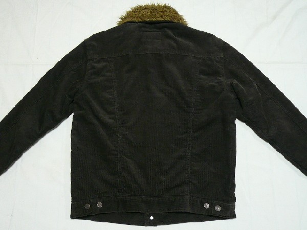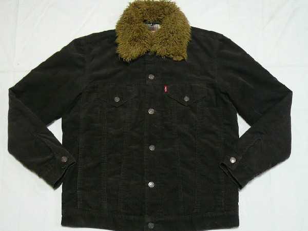 LEVISリーバイスのデイリー・カジュアル・ライン「RED TAB」シリーズのコーデュロイ・シェルパ・トラッカー・ジャケットのサイズLARGE(40相当)になります。品番70500-0005。カラーはブラウンになります。中畝のコーデュロイ素材のトラッカー・ジャケットでポリエステル中綿のベージュ/ブラウンのフランネル生地のキルティングがライニングされたウィンター仕様のアウター・ジャッケットになります。ボア・カラーはブラウンで着脱可能、両腹部にハンドウォーム・ポケットと、袖内側は袖通りの良いポリエステルのキルティング仕様、フロントは亜鉛ボタン、リーバイス伝統のシェルパ・トラッカー・ジャケットをカジュアルで肌触りが良く保温性の高いコーデュロイ素材で仕上げたアメリカン・クラッシックなウインタージャケットになります。状態は着用によるシワやアタリなどの若干の使用感がありますがコーデュロイのキズやダメージのある箇所も見られず、色落ちの少ないきれいな状態でライニングもヨゴレやステッチ切れなどのダメージのある箇所は無く、衿のボアのヨゴレなども無く非常に良い状態になると思います。メーカー適合サイズは、胸囲96~104cm、身長175~185cm、素材表記は表地綿63%、ポリエステル37%、裏地綿100%、袖裏地ポリエステル100%、中綿ポリエステル100%、パイル(ボア)80%、ポリエステル20%。 実寸は肩幅約50cm、着丈(衿下より)約64cm、身幅(腋下で)約58cm、袖丈約62cmとなります。(素人採寸ですので多少の誤差はお許し下さい。)2006年8月製造。中国製。オーソドックスでカジュアルなトラッカー・スタイルでタン・カラーのチノ・パンツやブルー・デニムなどのボトムスと合わせるのが容易なタイプのウィンター・ジャケットになります。 | |||