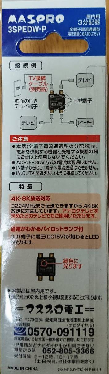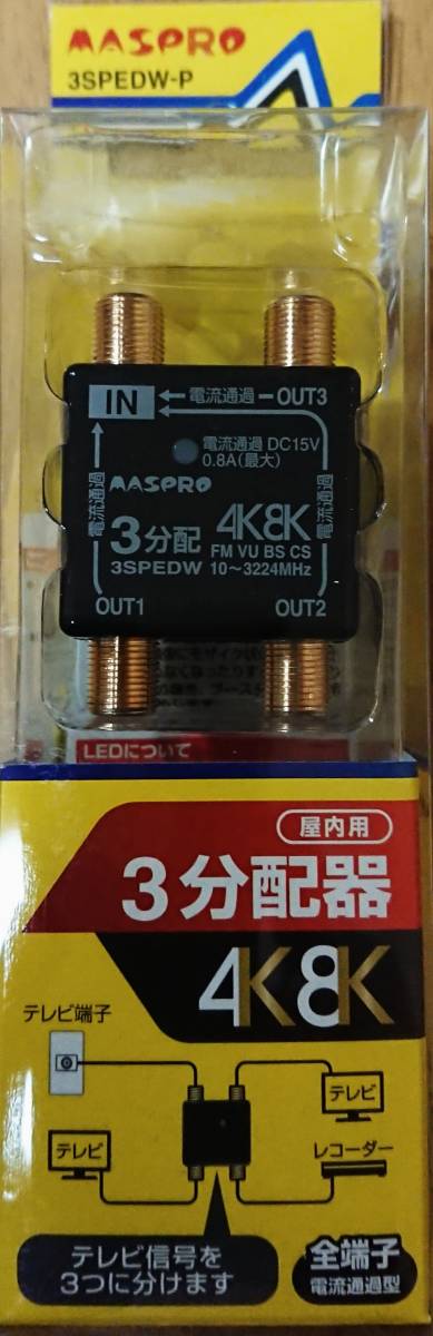 ■4K・8K放送対応 3224MHzまで伝送できますから、4K・8K放送に 対応しています。 アナログテレビを含めたどのテレビでもご使用いただけます。 ■通電がわかるパイロットランプ付 OUT端子に電圧(DC15V)が加わるとLEDが光ります。 ○全端子電流通過型。 ○金メッキ端子。 ○品番:3SPEDW-P ○希望小売価格:7,920円(消費税別) 商品説明 ⇒詳細はこちらでご確認ください。 | ||||