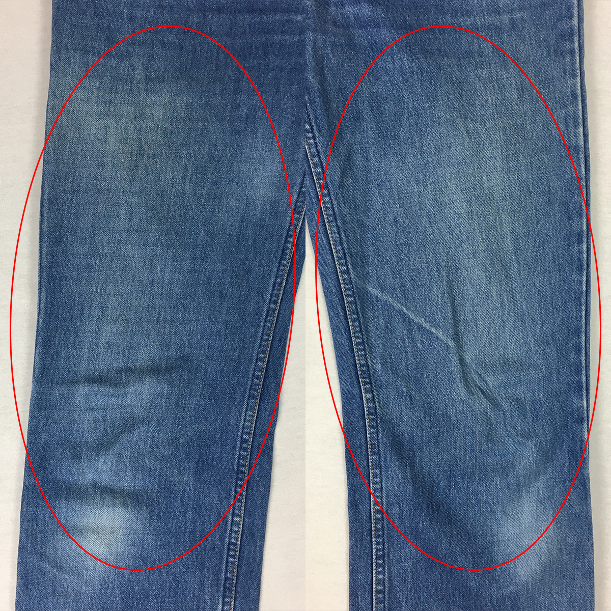 正面両太ももから膝にかけて若干茶色く汚れてくすんだ感じの色合いです。