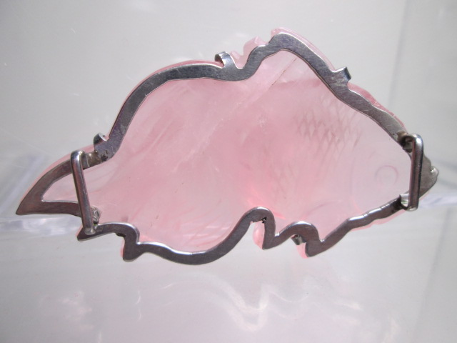 ぷっくら可愛い金魚のモチーフです。優しいピンク色が可愛いらしさを増します。尾びれの先の裏側金具の間に小さな欠けが有りますが目立つものでは有りません。