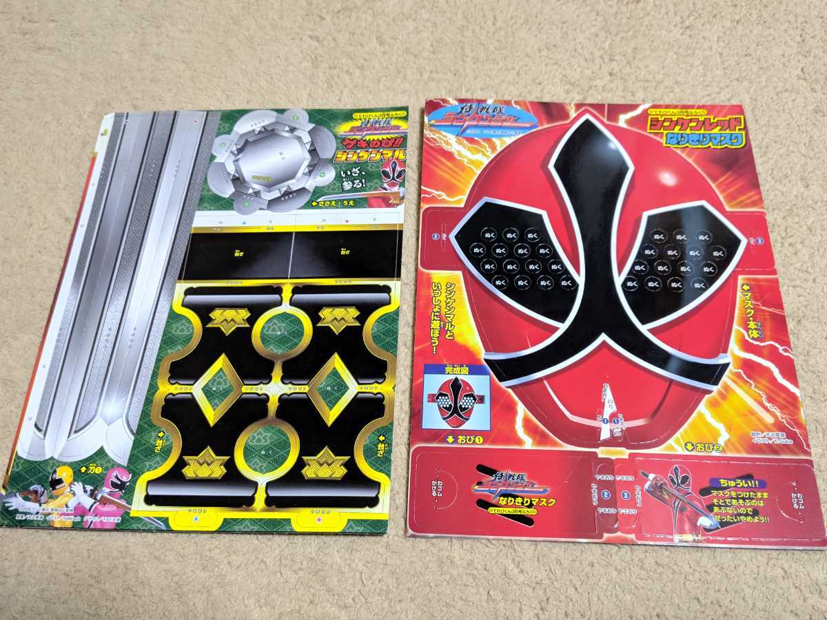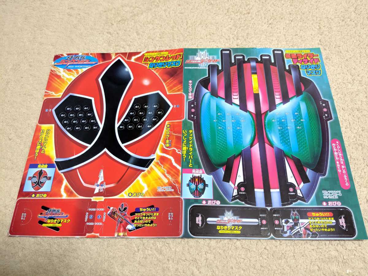 こちらはてれびくん限定付録「シンケンレッド 仮面ライダーディケイド なりきりマスク」と「げきのび!! シンケンマル」の2種類セットです。おまけとして写真5、6枚目の「折ろう!獅子折神!!」もお付けいたします。すべて未組立品となります。当方、タバコやペットの環境はありません。