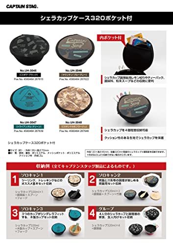 320ml用(ポケット付)・トライアングル/グリーン・グリーン 外径135×高さ70mm UH-3047・・Style:320ml用(ポケット付)・トライアングル/グリーン・製品サイズ:(約)外径135×高さ70mm・使用可能サイズ:外径120×高さ45mm、容量320ml程度のシェラカップ4個程度収納できます。※形状などにより収納できない場合がございます。・製品重量:(約)54g・材質:表地・裏地/ポリエステル、メッシュポケット/ポリエステル、クッション材/合成ゴム・原産国:中国シェラカップを4個程度収納可能。 クッション性のある生地でシェラカップを保護。 ■内ポケット付 …シェラカップ調理器用レモン絞りや調味料、粉末スープなどの収納に便利。 【収納例】(全てキャプテンスタッグ製品によるものです。) ・シェラカップ4個+調理器 ・シェラカップ2個+調理器+竹製フタ ・シェラカップ2個+調理器+シェラカップフォーク ・シェラカップ2個+調理器+シェラカップスプーン 製品サイズ:(約)外径135×高さ70mm 使用可能サイズ:外径120×高さ45mm、容量320ml程度のシェラカップ4個程度収納できます。 ※形状などにより収納できない場合がございます。 製品重量:(約)54g 材質:表地・裏地/ポリエステル、メッシュポケット/ポリエステル、クッション材/合成ゴム 原産国:中国