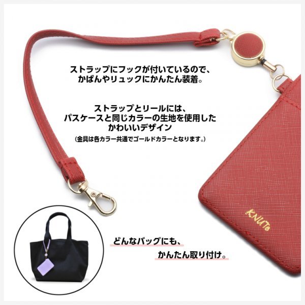 ・リールは最大約36cmまで伸縮が可能。リールとスラップには、パスケース本体と同じカラーの生地を使用しています。(リールの本体は各カラー共通でゴールドカラーとなります。)