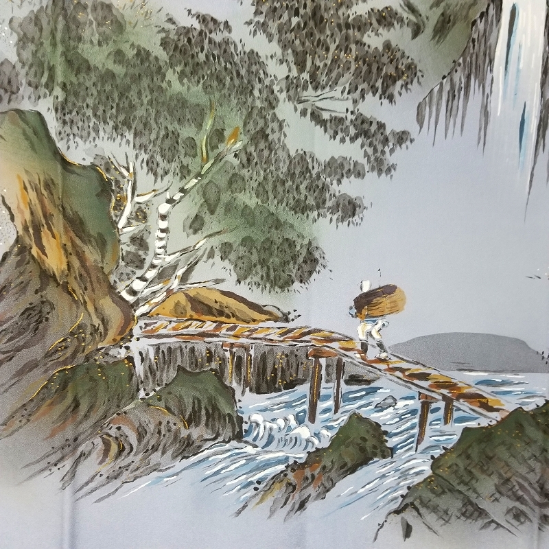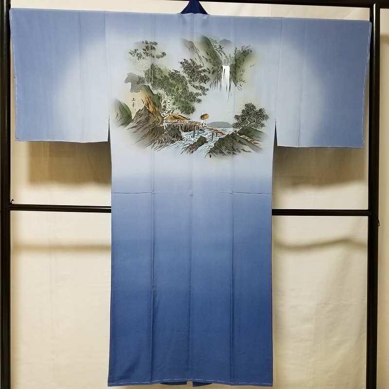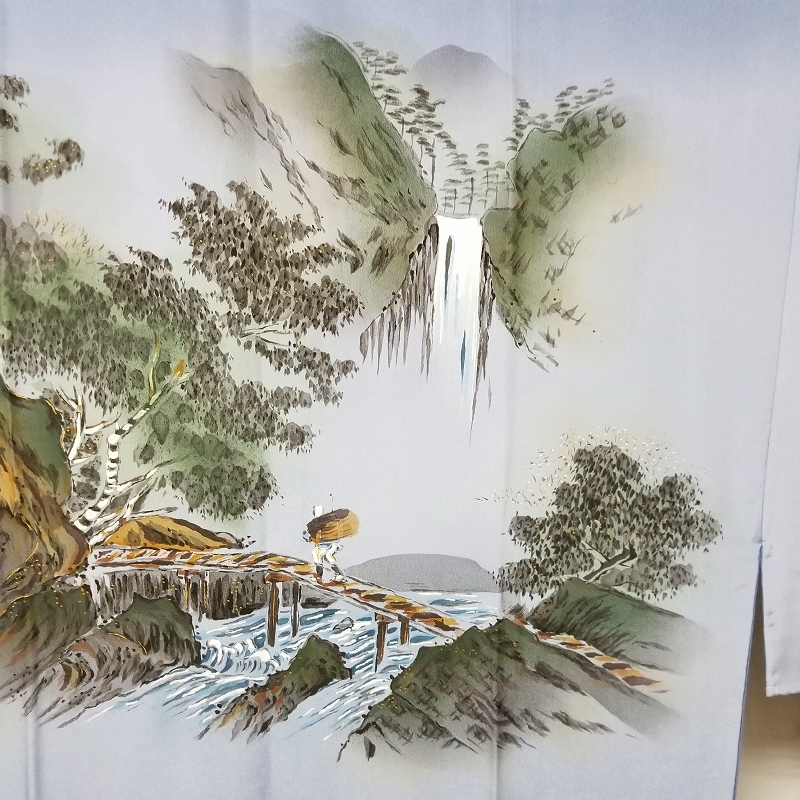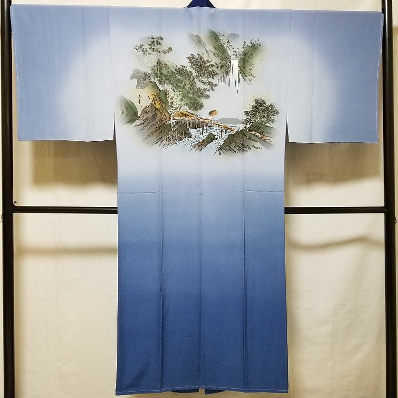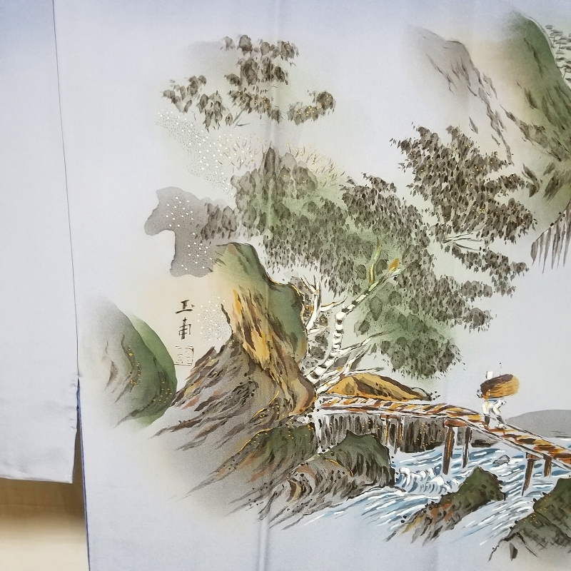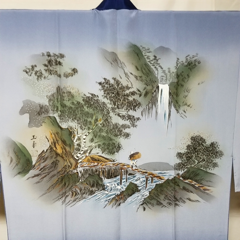 *中古品 *仕付け糸付き *未使用品 *検品済 *美品 *正絹*塩瀬地*半衿付き「美品」 {生地} ☆正絹 チエニ-重目地 ☆重さ 約 610g {地色} ☆紫みの薄青色地 ☆裾一帯の暈し染色は.上部の地色より濃い.くすんだ紫みの青色です {模様} ☆手描き染*暈し染*金加工の山水画を精緻に描いております {胴裏地} ☆正絹 羽二重地**美品 ☆青み灰色 ◎消費税は.お預かりしておりません◎ {寸法} 襦袢丈 {肩から裾まで} 約139cm 裄丈 約69cm 袖丈 約50cm 袖幅 約35cm 前幅 約29cm 後幅 約30.5cm (発送方法) ●大阪から ゆうぱっく発送 {補償あり}**おてがる配送 ◎ t6227jp 桐輪 「呉服の桐正」でも色々と出品しております** {注意事項} (注意事項 必ずお読みください!) ★基本的に土、日、祝日、ゴールデンウィーク、お盆、年末年始はお休みさせて頂いておりますので、ご連絡が遅れる場合もございますので、ご了承ください。 ★どうぞ自己紹介欄も、是非御覧になって下さいませ。 ●落札後にヤフーから届くメールに、メッセージを記載しておりますので、 そちらも必ずご覧下さいませ。 ●当方、ストア出品ではなく、一日中パソコンに向かっておらず、ご連絡は夜になる事が多いです。その点御理解の上、ご入札下さい。 ●お急ぎの場合など、到着希望の日にちが特に近い場合、ご要望にお答えできかねる場合もございます。もちろん、出来る限り、早急に対応はさせて頂きますが、 その点は、何卒ご了承下さいませ。 入札前に、発送が間に合うかご質問頂けるとありがたいです ★★基本的に返品、クレームはお受け致しておりませんが、万が一、商品に不都合(大幅な寸法間違い 記載以外の着用不可能な位の、大きなシミ、傷みなどの見落とし)などがございました場合、まず、取引ナビにてご連絡下さいませ。 迅速に対応させて頂きます。 ただし ●商品がお客様の元に到着後、1週間以上経過したもの。 ●お客様側で加工など、手を加えた物。 ●お色目が、思っていたものと違っていた、または、思っていた感じと違っていた。 (画像はできるだけ実物に近い色で写るように努力していますが、素人の撮影ですので、どうしてもPCによって多少違ってくる事があります。出来るだけ、分かりやすいように説明は入れさせて頂きます。分かりにくい場合、ご質問下さい。) 以上につきましては、対応出来ませんので、ご理解下さい。 ★複数商品の落札予定のある場合、ご連絡頂きましたら、1週間程でしたら、お取り置させて頂きます。 お気軽に、お申し出下さいませ。 ★送料は、1個で発送が無理な場合は、こちらよりご連絡させて頂きます。 | |||