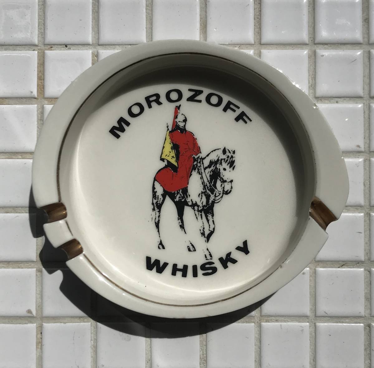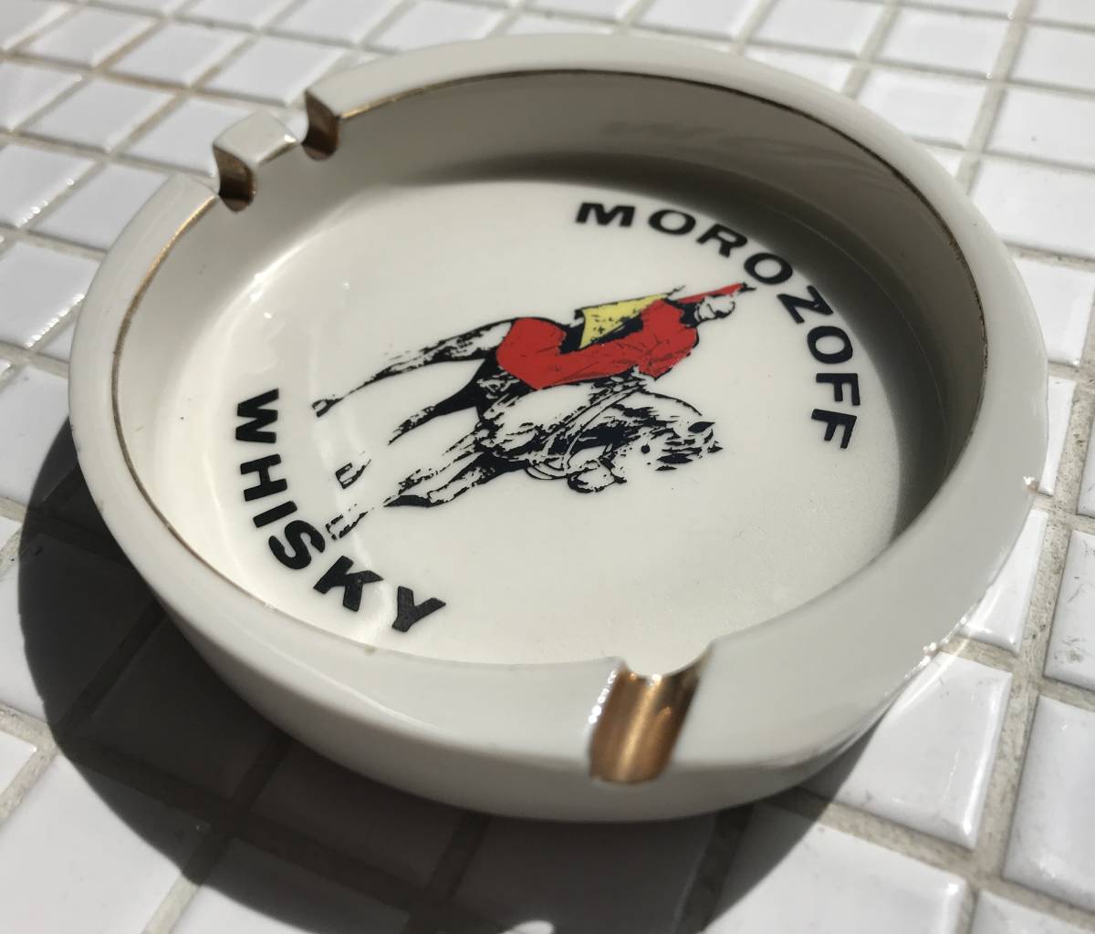 馬に跨った騎兵の絵と「MOROZOFF WHISKY」の文字が印刷された陶器製の灰皿です。