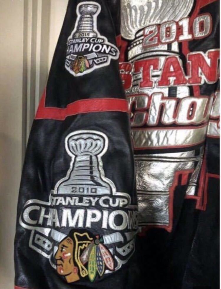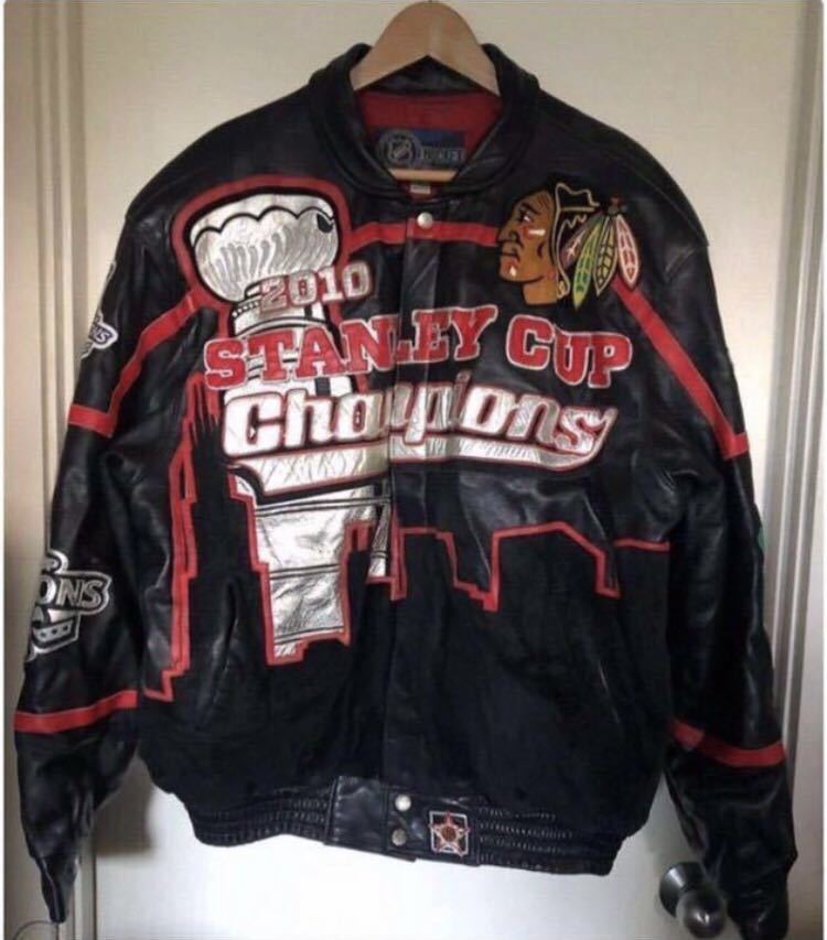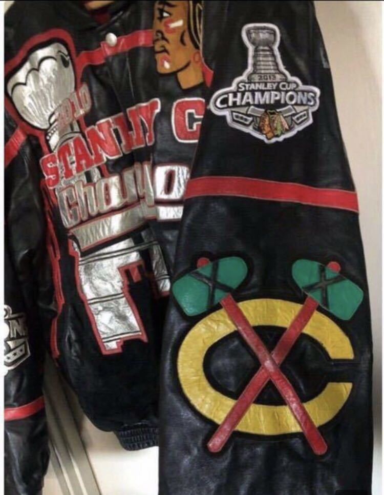 ブラックホークスのチャンピオン ジャケット です オールレザー です