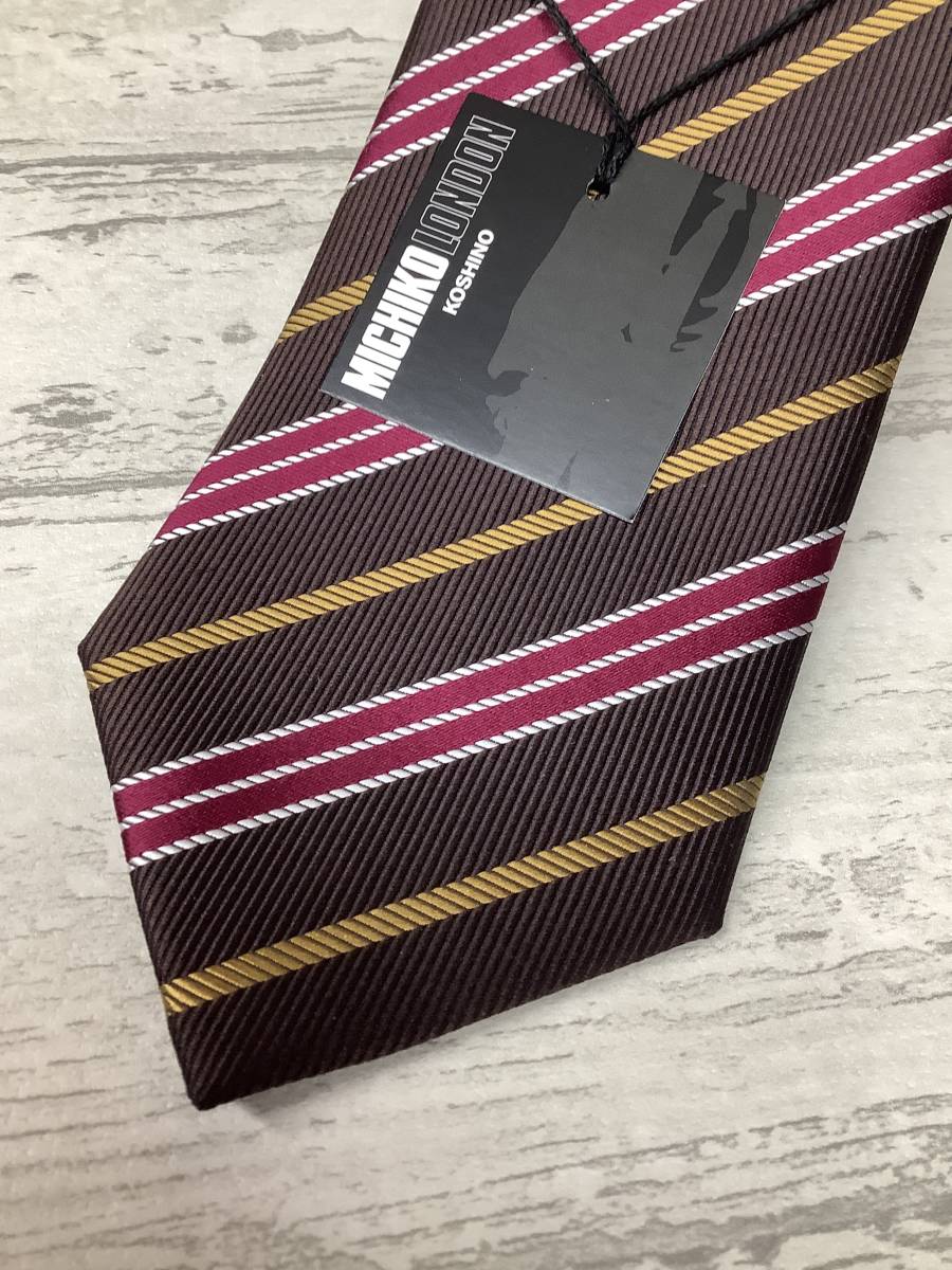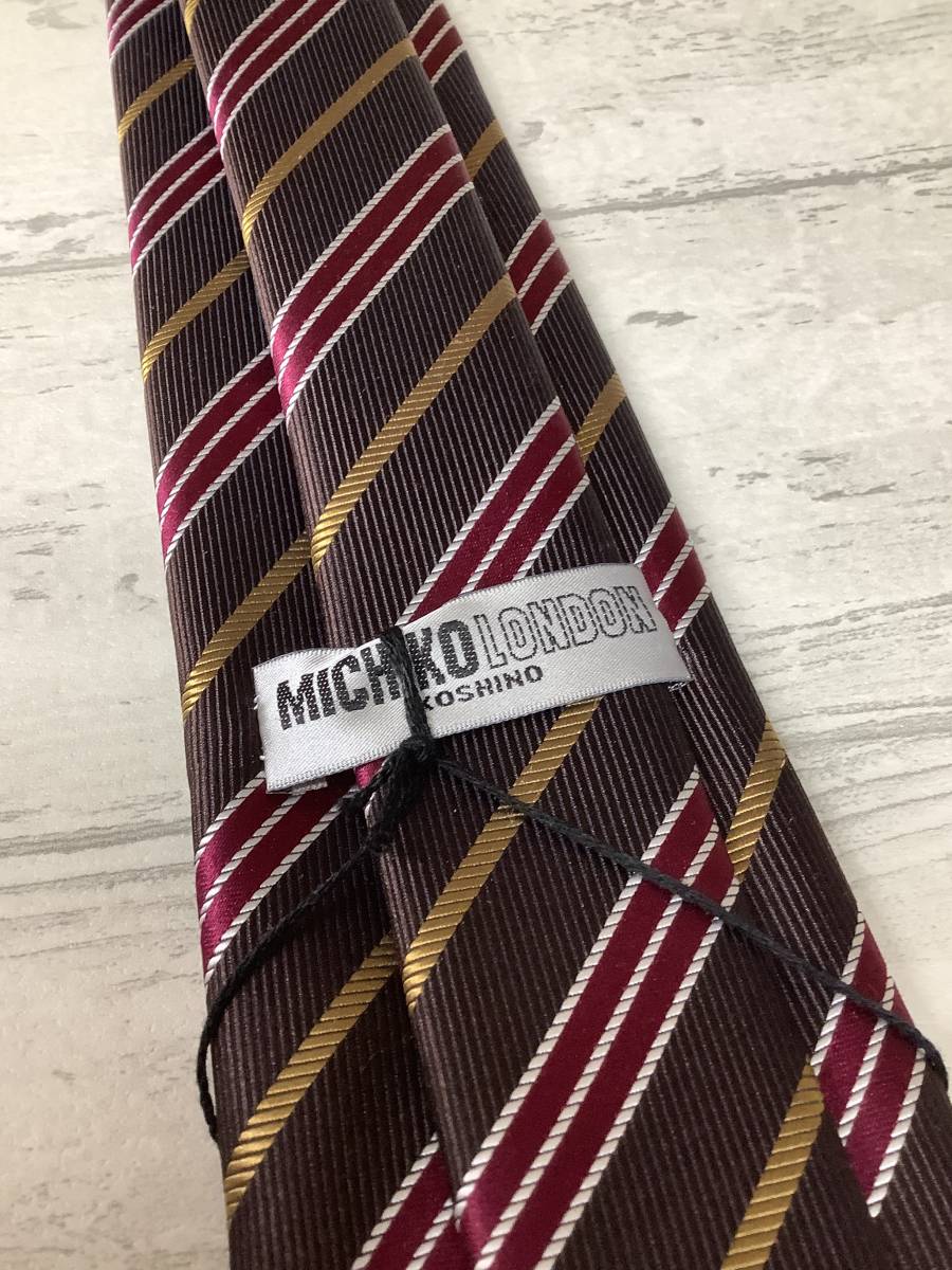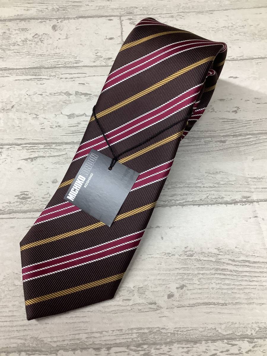 新品未使用★ミチコロンドン★日本製ネクタイ  流行りのブラウン系ストライプ シルク100%のお買い得サービス