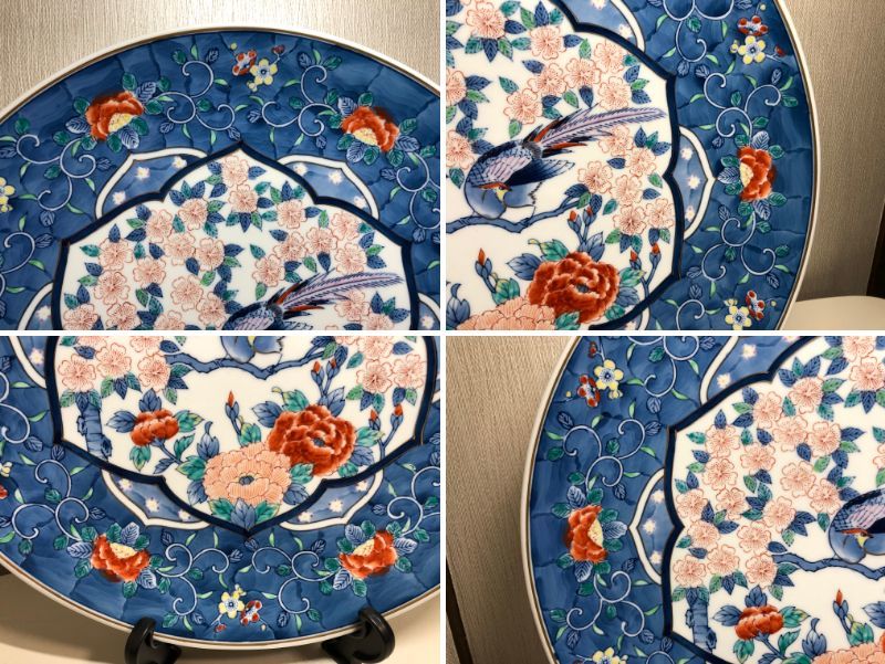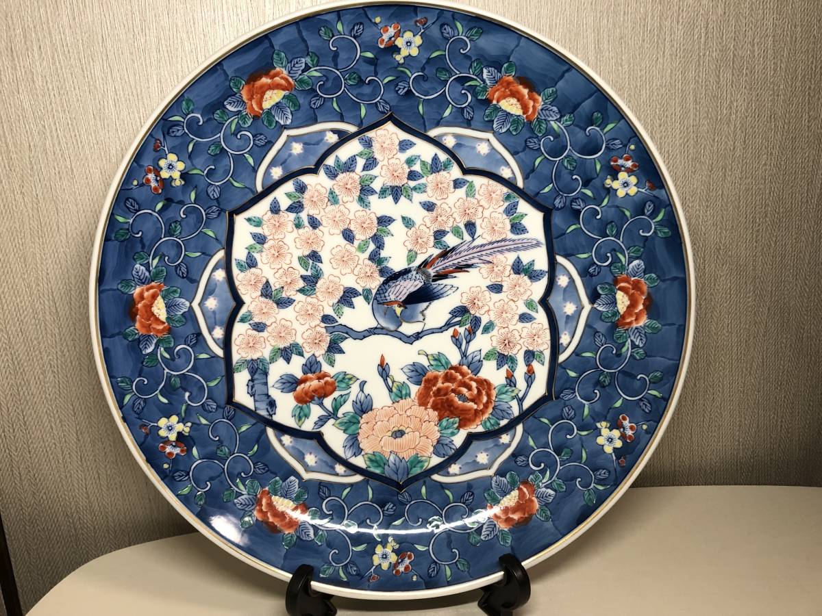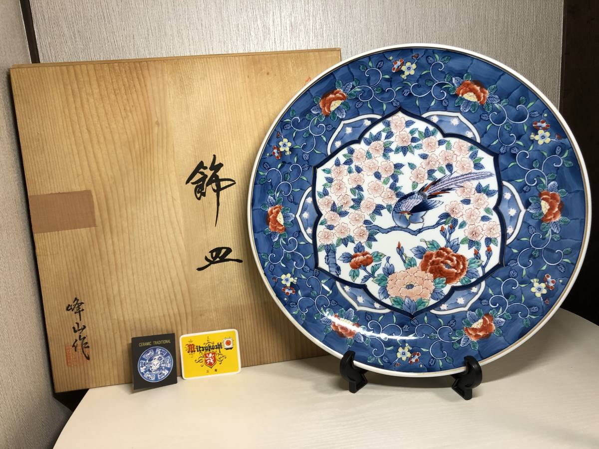 有田焼 飾皿 峰山作 渕唐草梅花鳥 大皿 絵皿 飾り皿 額皿 盛皿 御皿 オブジェ インテリア 肥前焼 伊万里焼 和食器 直径39.8cm 牡丹 金彩