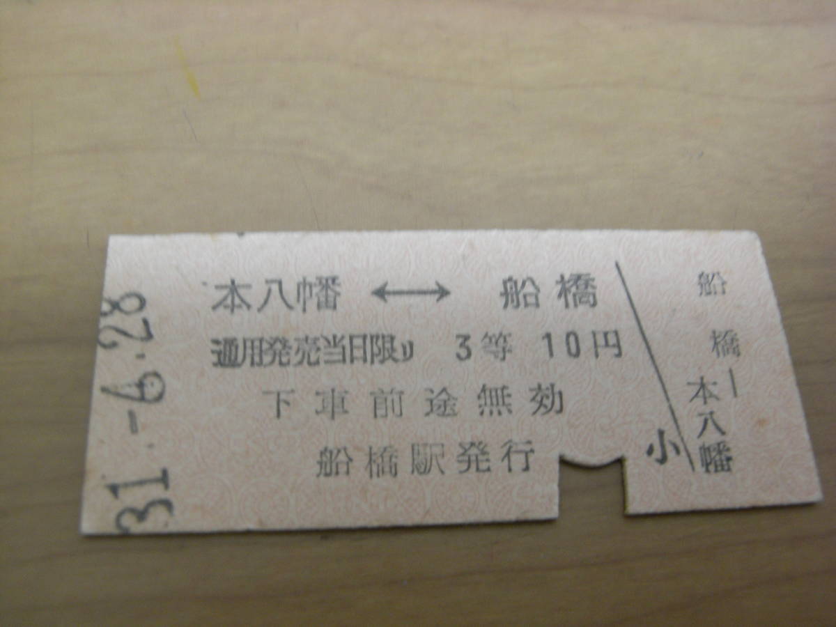 総武本線 本八幡-船橋 3等10円 昭和31年6月28日 船橋駅発行 国鉄