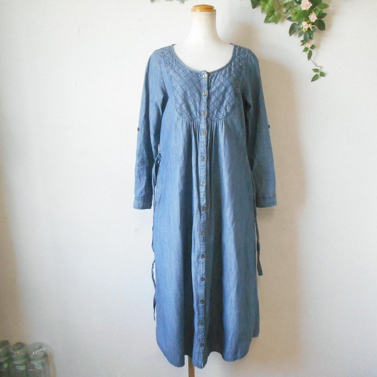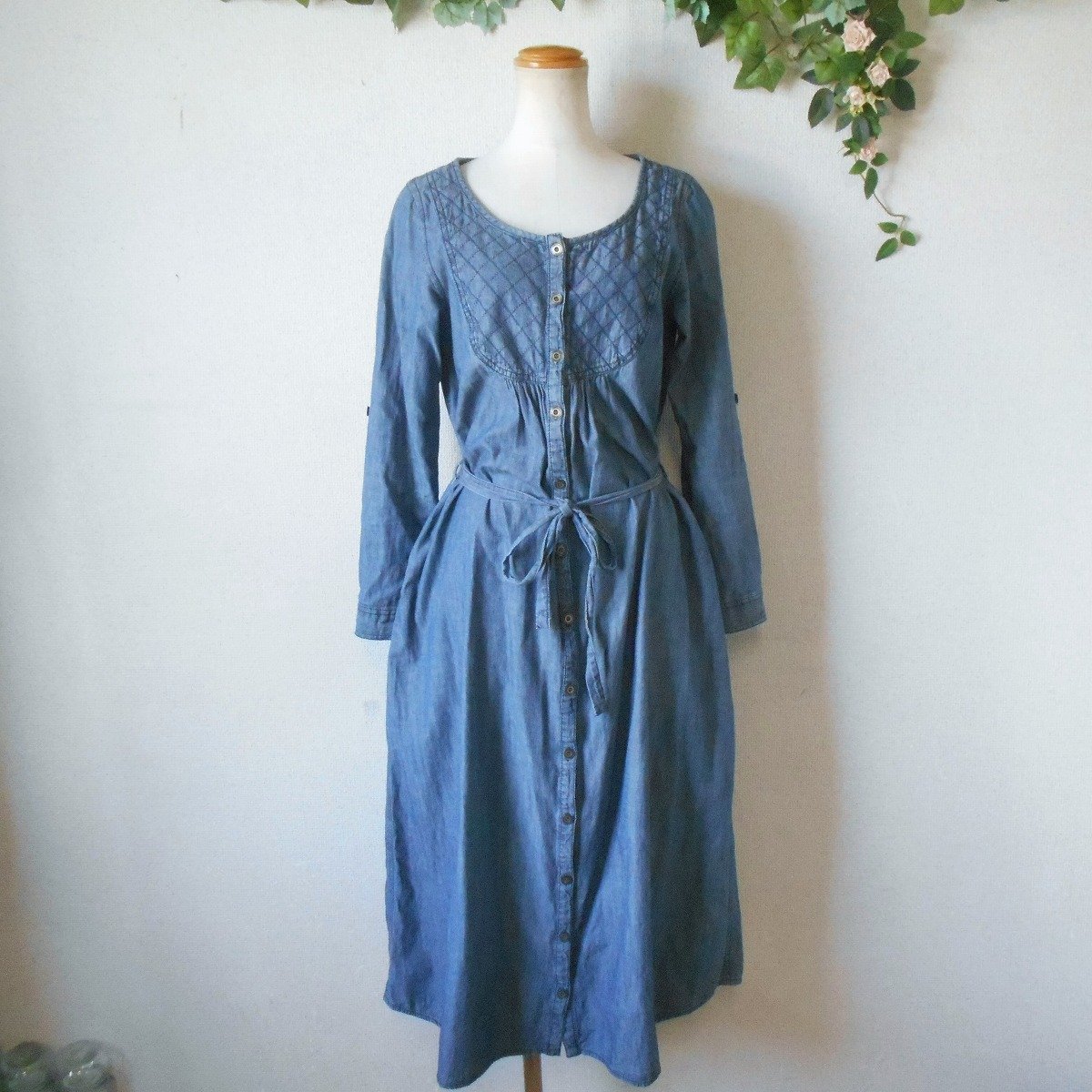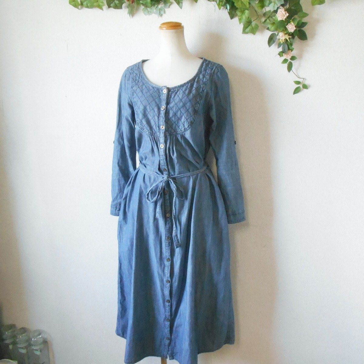 【ポイント】ショコラフィネローブのワンピースになります。お色はブルー系で春や秋を中心に着ていただけるお品です。ウエスト部分でリボンが結べるデザインでとっても可愛い一着です。