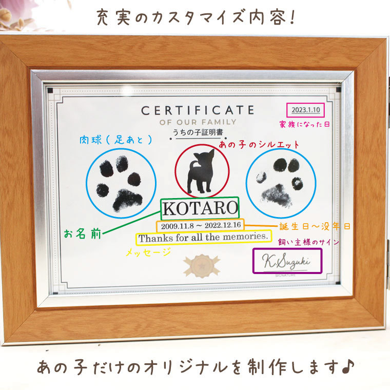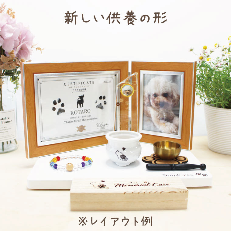 大好きなあの子の写真が位牌や遺影の代わりになります。 可愛いトロフィーのお位牌デザインです。お名前、お誕生月、楽しかった季節の思い出など…かわいらしい時節のイメージをお持ちのあの子に。 変色の少ないフルカラーのペット遺影・お位牌。モダンなデザインですので、洋室・和室問わずどんなペット仏壇・仏具ともよく合います仏壇やリビングなどに安置して、大好きだったあの子の手元供養にご利用ください。サイズ:W5×D2.5×H15cm素材:クリスタルガラス【 ご注文の前にご確認ください 】オーダーメイド品は、レイアウト(完成見本)をご確認いただいたのち、 ご依頼者様よりご進行の許可をお受けしてから、製作を開始いたします。印字・刻印商品ですので、作業を開始いたしました後の内容の変更・キャンセル等はお受けできません。内容の変更・キャンセルをご希望の場合には、必ず最終進行前にお申し出いただきますようお願いいたします。レイアウト(完成見本)はサンプルのため、仕上がりに多少の差異が出ることがございますが、原則的にオーダーメイド品のご返品はお受けできかねますので、予めご了承ください。
