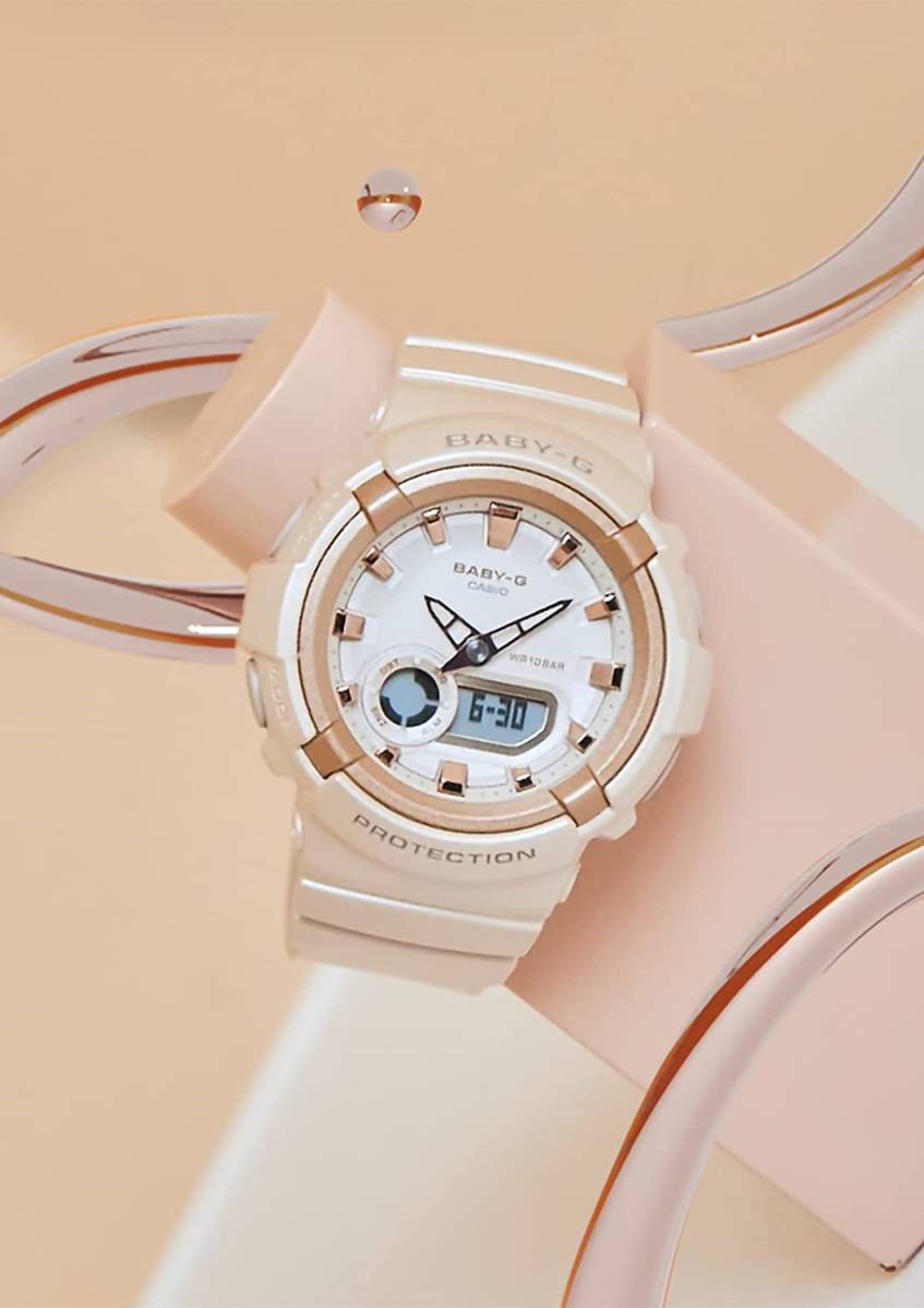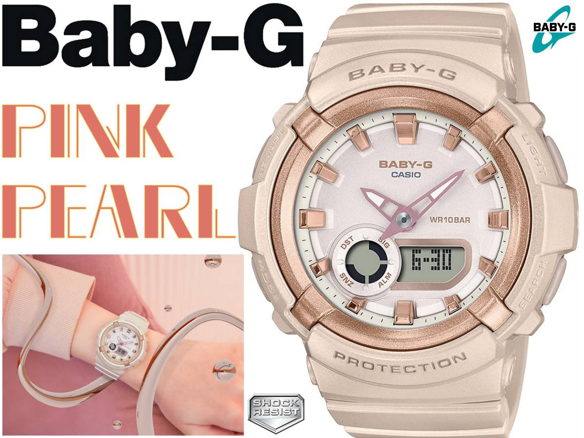 アクティブな女性に向けた耐衝撃・カジュアルウオッチBABY-Gから、ベーシックスタイルと相性の良いカラーのモデルです。ベースモデルは丸みのあるシルエットとパーツを重ねた多層構造ケースが特徴のBGA-280を採用。カラーは幅広いファッションに取り入れやすいくすみ系のネイビーとピンクベージュの2色をラインアップしました。ピンクベージュのモデルはパール塗装を施し、光沢感のある印象に。ベゼルリングのメタリック仕上げとダイアルのインデックスの蒸着仕上げで、華やかさをプラスしています。機能面では、耐衝撃構造や10気圧防水機能など日常生活で頼れる機能を備えています。ベーシックカジュアルで実用性の高いウオッチです。