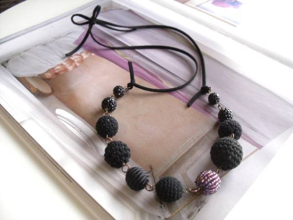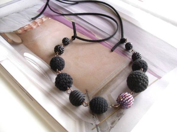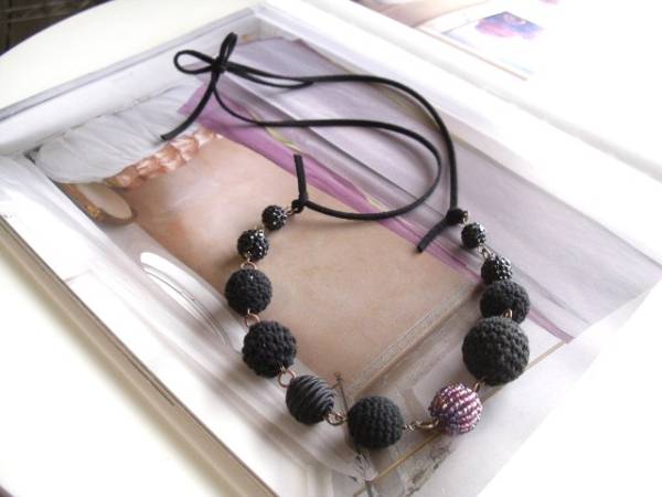 色で遊んで・・シリーズです♪黒のセレクト・・シックな黒の異素材のネックレスです♪10ミリから20ミリ位までの黒の編み玉やサテンボールやラインストーン玉にパープルのビーズ玉などシックな異素材を集めました♪黒のスェード紐を合わせて甘すぎない大人のロマンチックしています♪ネックレスの長さは全長90センチ位です♪短く結んでチョーカー風にされても素敵です♪お揃いのブレスレットも出品しています♪ハンドメイドをご理解いただいてノークレーム・ノーリターンでお願いします♪