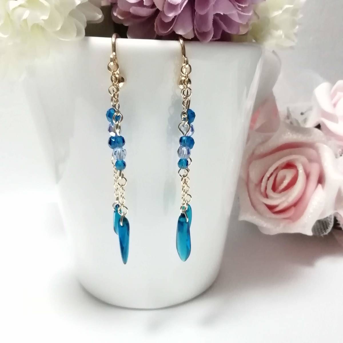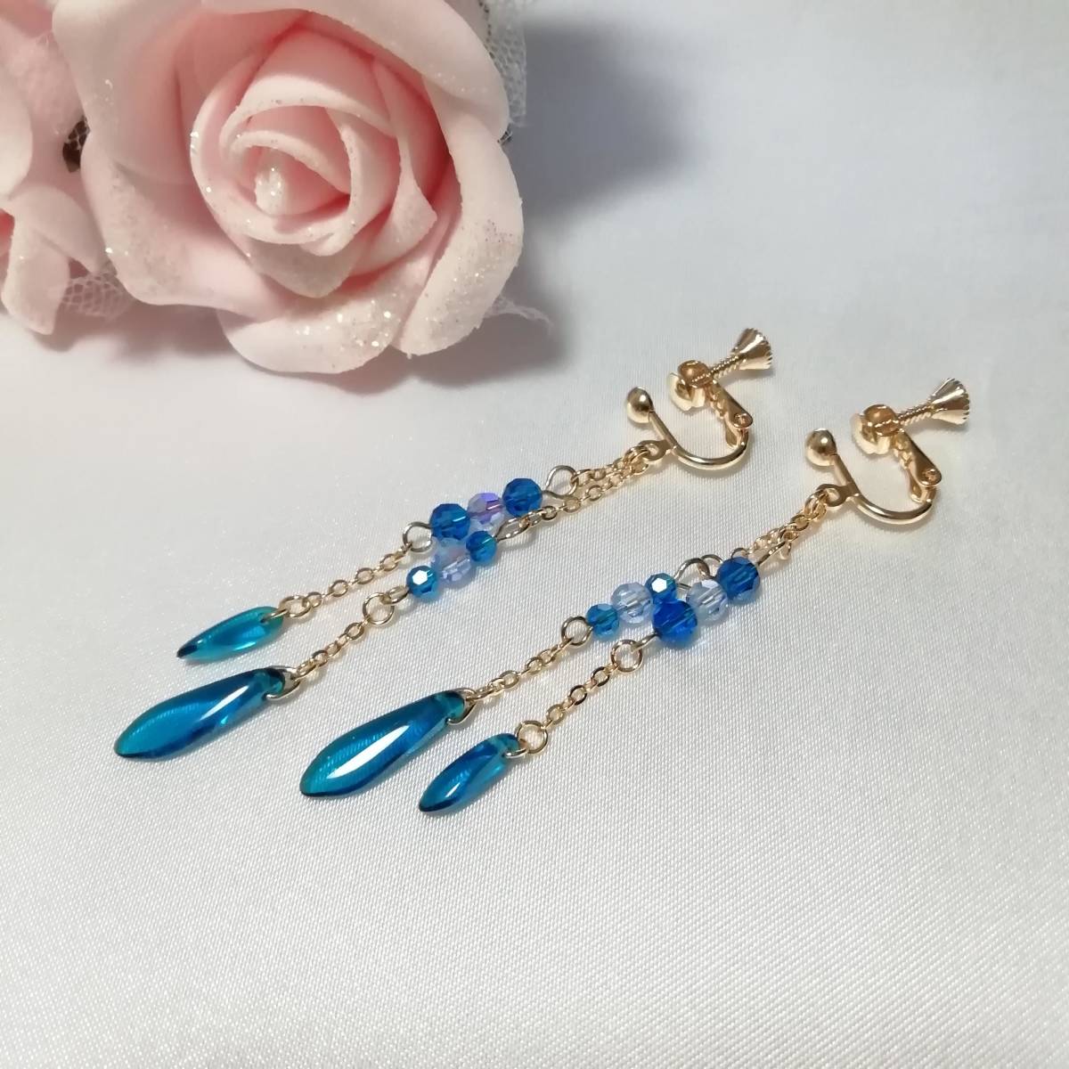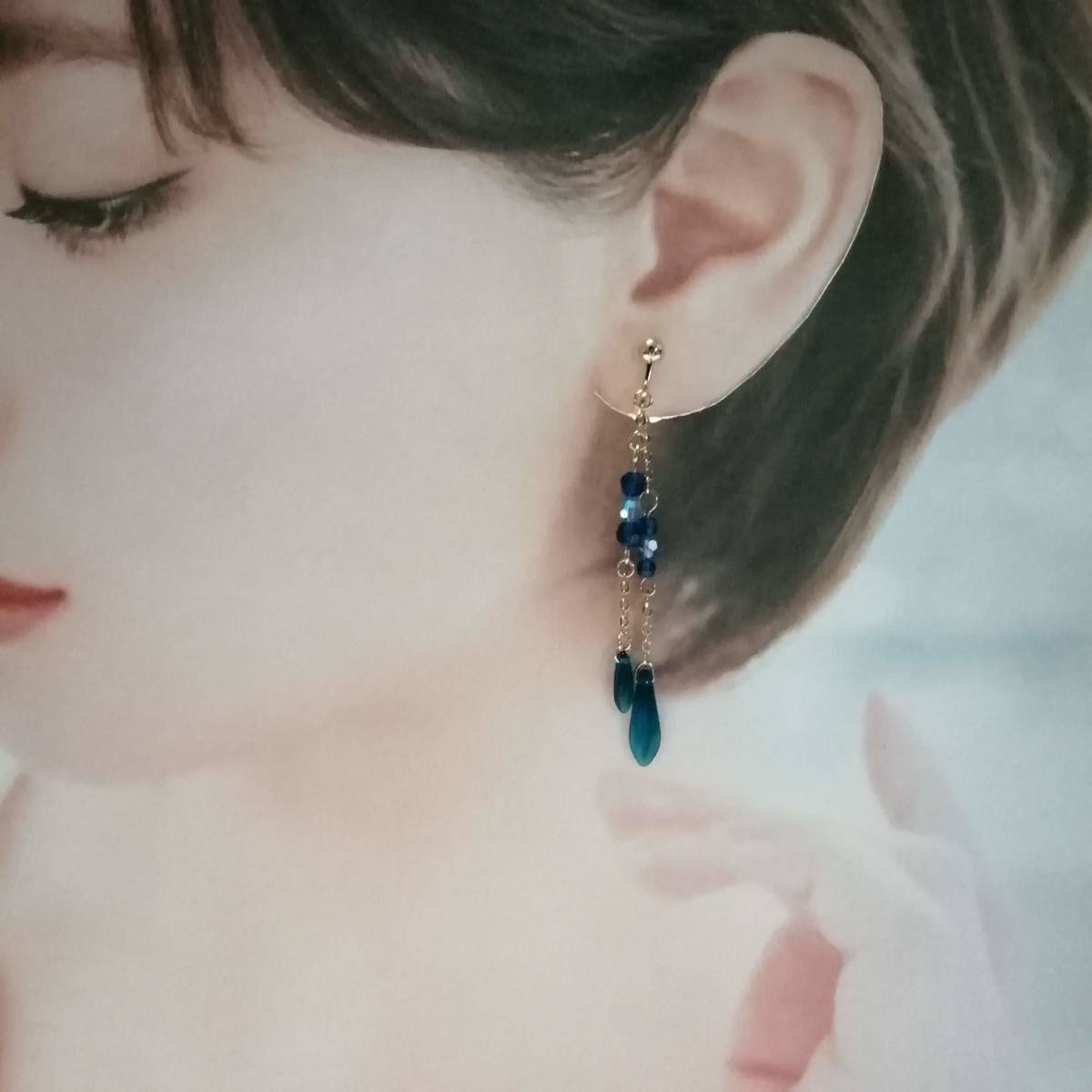 | ★商品内容★ チェコダガーカプリブルーのハンドメイドイヤリング★チェコ/ゴールド/上品/カプリブルー/スワロフスキー/ライトサファイア/ダガー/爽やか チェコダガーとスワロフスキーのカプリブルービーズを ゴールドパーツと組み合わせた 爽やかな印象的なイヤリングです。*・.**.・。**.・。*・**。・ 間に挟んだスワロフスキーライトサファイアの煌きも美しく 上品でスタイリッシュな大人の女性らしさを印象付けます*・.**.・。**.・。*・**。・ 普段使いはもちろん、お出掛けにも イベントなどのお洒落のワンポイントにも最適です*・**.・。**.・。*・**。・ 【素材】 チェコダガー カプリブルー5mmx16mm チェコダガー カプリブルー3mmx10mm スワロフスキー5000ダイヤカット ライトサファイアAB4mm スワロフスキー5000ダイヤカット カプリブルー4mm スワロフスキー5000ダイヤカット カプリブルー3mm k16GPチェーン カンより垂れ下がる長さは、約5.8㎝です。 Eー1103 ★注意事項★ ***~ご購入前に必ずお読み下さい~*** *・*・*落札後について*・*・* *落札後4日以内にお手続き、ご連絡が無い場合は落札者都合で削除致します。 *発送日指定・ご入金の予定が1週間以上先をお考えの方は、入札の前に質問よりご連絡くださいませ。 予めご了承の上、ノークレーム・ノーリターンでお願い致します。 *・*・*商品について*・*・* *一点一点心を込めて作っておりますが、手作りなため多少の歪み等あるかもしれません。 手作りの味わいと、世界で一つだけの作品とお考えいただければ幸いです。 *デリケートな商品ですので、強く引っ張ったりすると破損する事もあります。 お取り扱いにはご注意ください。 *ご覧のPC、スマホによっては画像と実物の色味が多少異なる場合があります。 *基本イヤリング金具は跳ね上げネジ付き金具にて作成しております。 **ご希望によりピアスへの変更も承っております。 【フックピアス…無料/キャッチピアス…別途追加料金120円】 *その他…樹脂ノンホールピアス(無料)・カン付き樹脂ノンホールピアス(無料)にも変更をお受け致します。 ~ご注文の際にメッセージ欄よりお申し付け下さい~ 尚、金具変更のご希望が無い場合は、掲載された写真の金具にてお送り致します。 *金属アレルギーや化学物質アレルギーなどへの対応はしておりませんので、ご心配な方はご遠慮下さいますようお願い致します。 *永くご愛用頂くために、ご使用後は柔らかい布等で軽く拭いてください。 *・*・*プレゼント用梱包のご要望もお受けいたします*・*・* *その際は、梱包費用が別途で必要となりますのでご注意ください。 また、ご希望の梱包タイプによって、発送方法が変わりますので、送料が別途必要となります。 *プレゼント用梱包タイプ 【袋→100円】 ~発送方法【クリックポスト(送料無料)】⇒【合計100円の追加料金】 *プレゼント用梱包タイプ 【箱→200円】 ~発送方法【レターパックプラス(別途520円)】⇒【合計720円の追加料金】 となります。 ◆ご希望の場合は、必ず商品ページをウォッチリストに登録した上で落札前に質問にてお問合せ下さい。◆ ◆ご希望を承り次第、一度出品を取り消し、プレゼント用梱包費用、送料などを追加した金額へ変更し、再出品致します。◆ *再出品後に再度検索して頂く手間が省けますため、プレゼント梱包をご希望の場合は必ずウォッチリストへのご登録をお願い致します。 金額変更後の再出品から3日以内に落札されなかった場合、誠に勝手ながら購入する意思がないとみなしまして、元の金額へ修正致します。 また、修正後、再度プレゼント用梱包のご希望のお問い合わせを頂きましても、お断りをさせていただきますのでご注意ください。 ご不明な点がございましたら、落札前に質問よりお願い致します。 ***ご質問について*** *ご購入前にお願い致します。 日中は仕事をしておりますので、ご返事が直ぐに出来ない場合がございます。 出来る限り早い対応を心がけますが、ご了承ください。 また、発送までには、お振込み確認後、翌日の発送を心がけておりますが、仕事の都合により2~3日程かかる場合がございます。(その際にはナビにてご連絡いたします) お急ぎの場合は、極力対応いたしますが、場合によっては対応致しかねる事もあります。ご了承下さいませ。 | |||